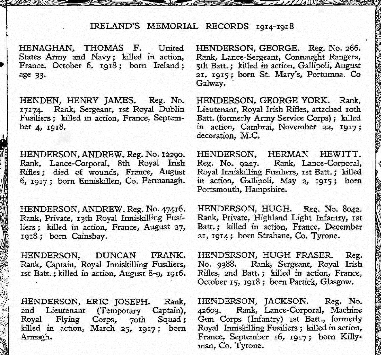 Son of Robert Hugh Henderson, C.M.G., M.L.A., and Mrs. Sarah Matilda Henderson, of Johannesburg, South Africa. Educated at St. Andrew's College, Grahamstown. ref. The sky their battlefield of Trevor Henshaw
