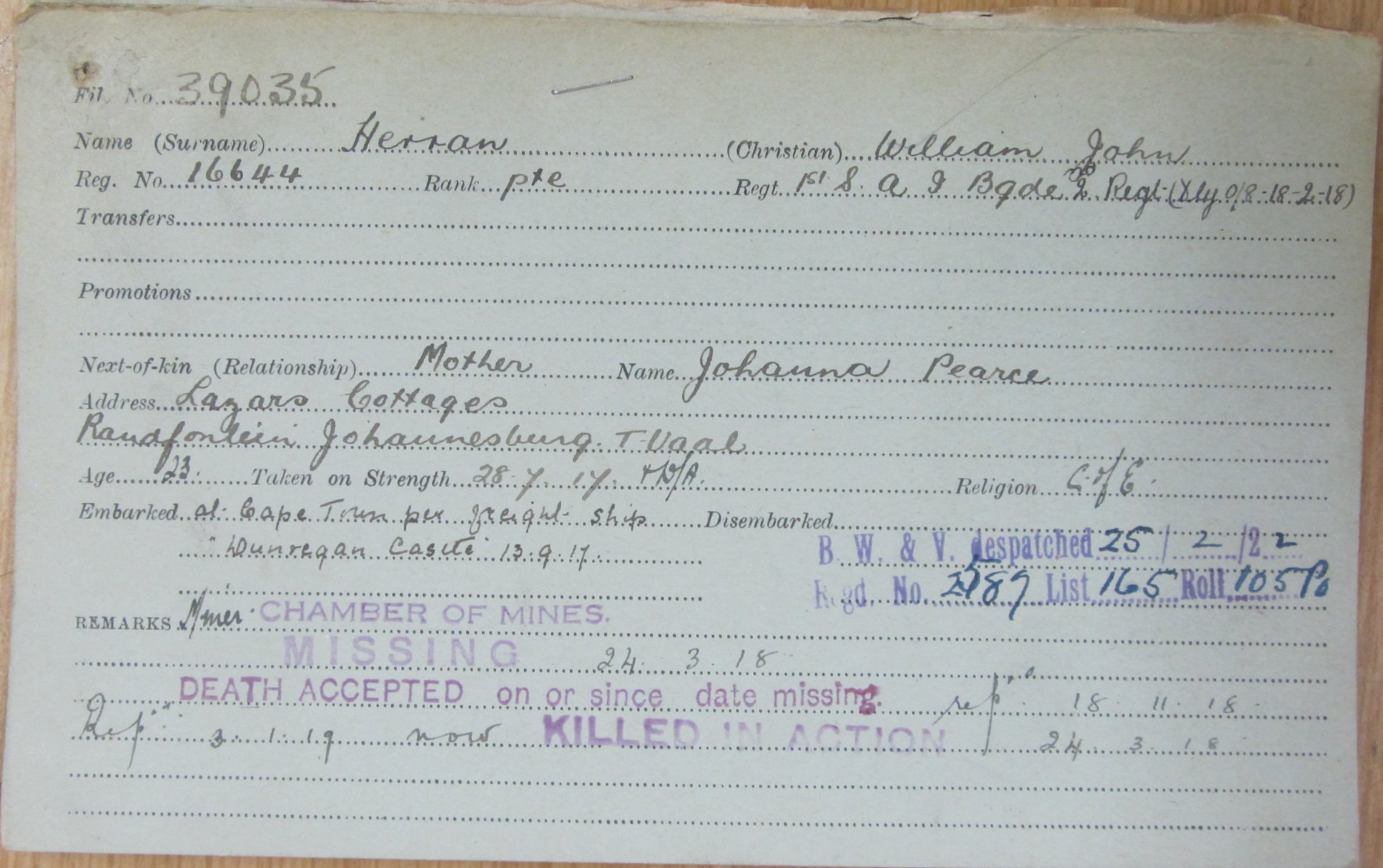 Son of Johanna Pearce, of Lazars Cottages, Randfontein, Johannesburg, Transvaal