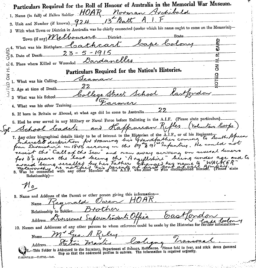 Son of Robert Percival and Isabella Cornelia Hoar, of 33, Currie St., East London, South Africa. Born Cathcart, South Africa. Educated College Street School East London. (Served as N A WALKER). On Cathcart War Memorial