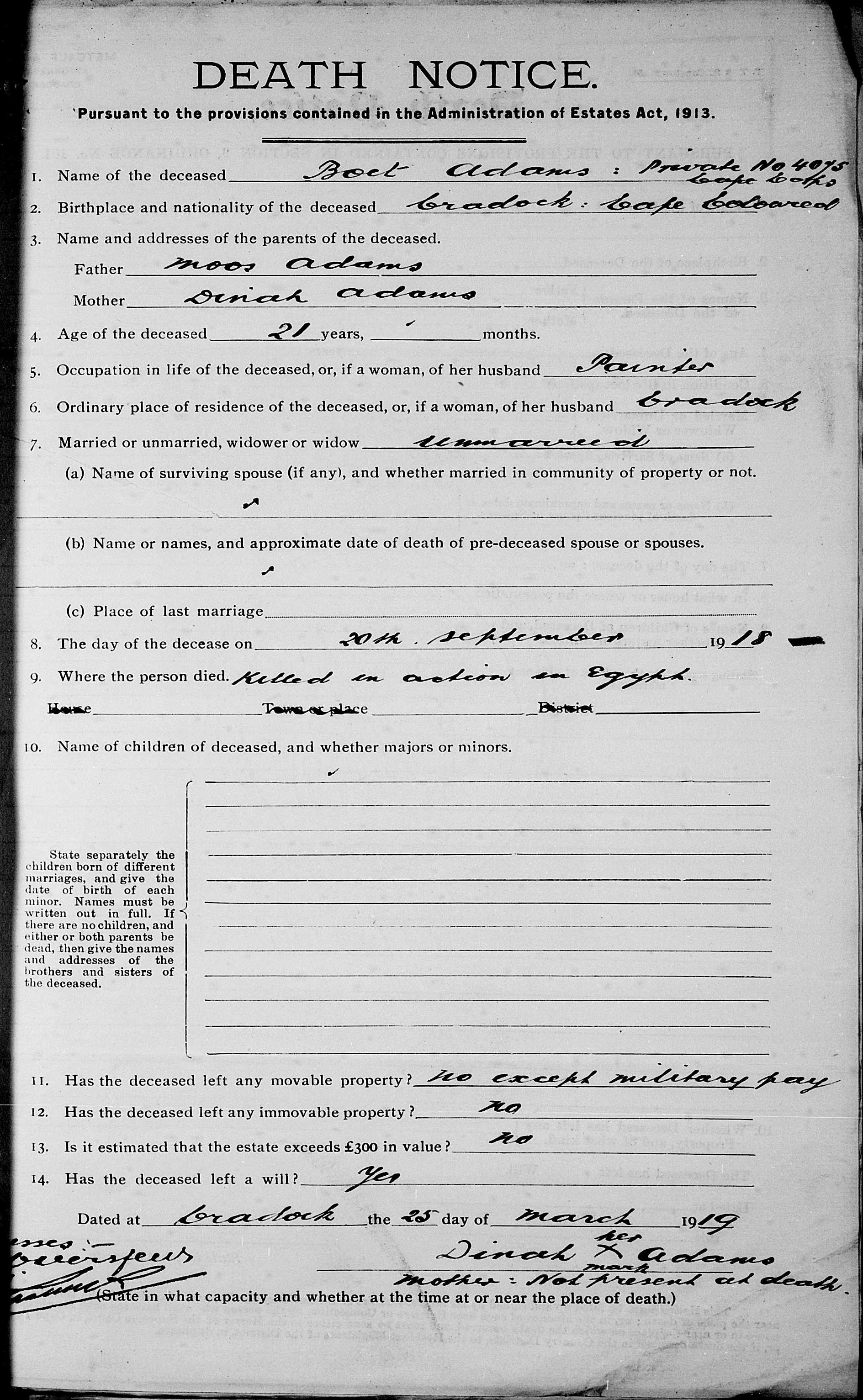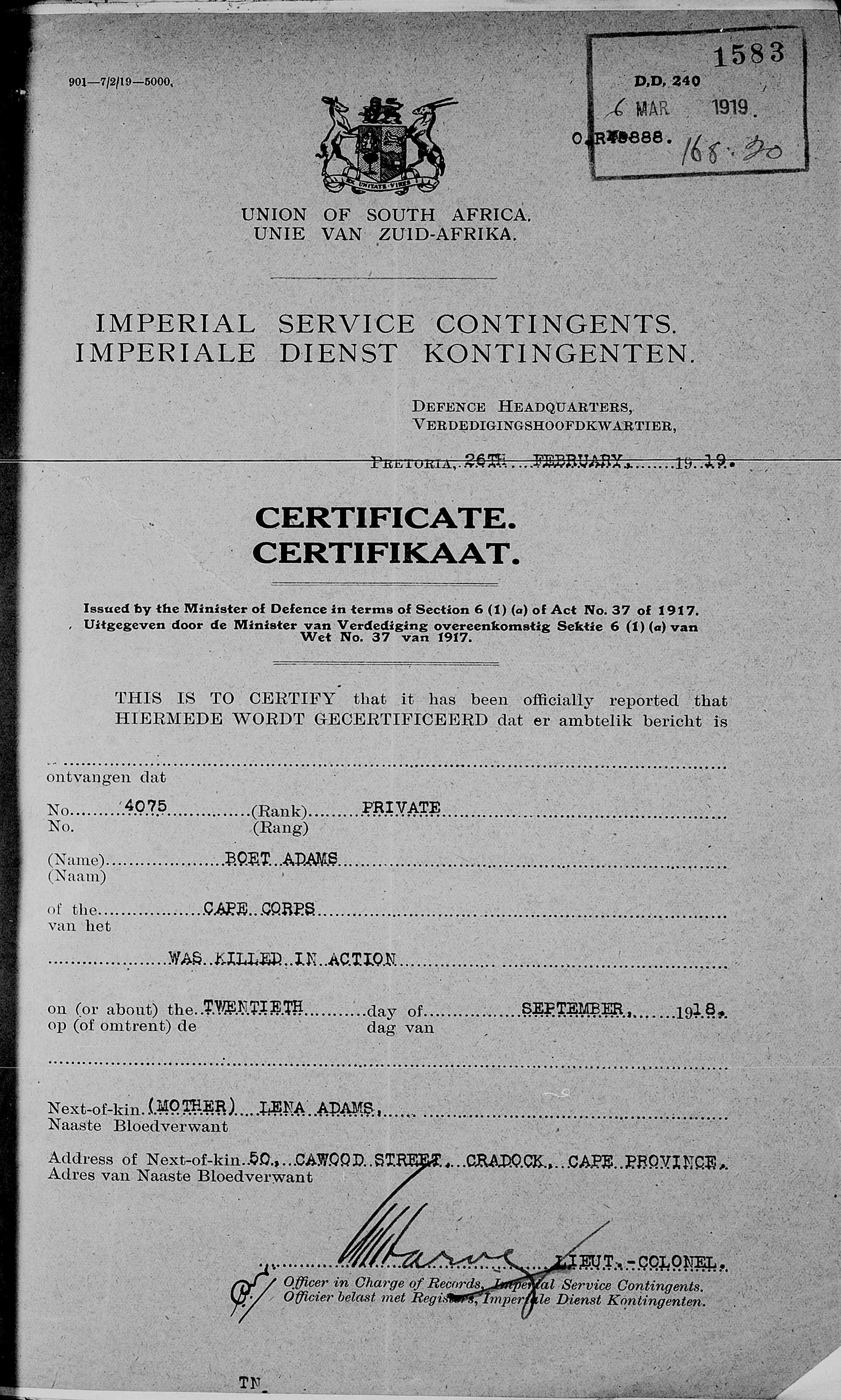 Son of Daniel and Lena Adams, of 50 Cawood St., Cradock, Cape Province |