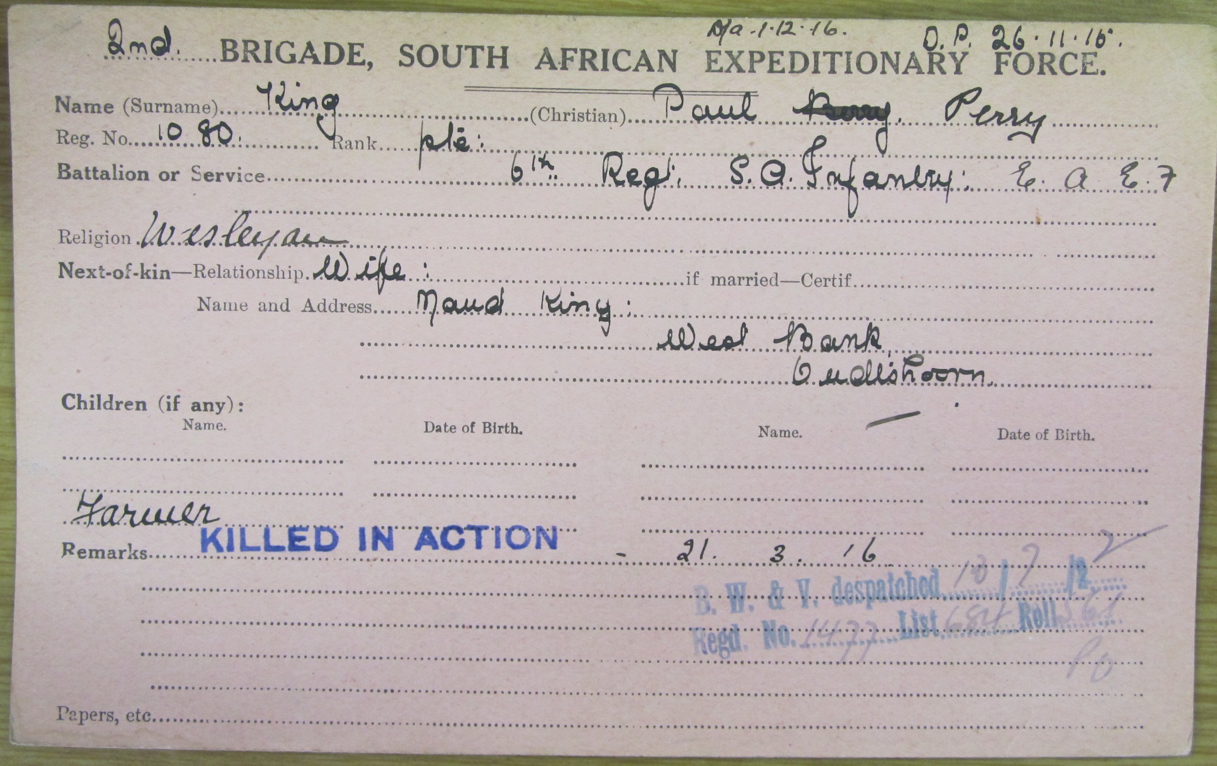 Son of John Tregunno and Hester Magdalena King, of West Bank, Oudtshoorn. Husband of Maud Lillian King, of West Bank, Oudtshoorn. Born Oudtshoorn, Cape Province. A farmer.