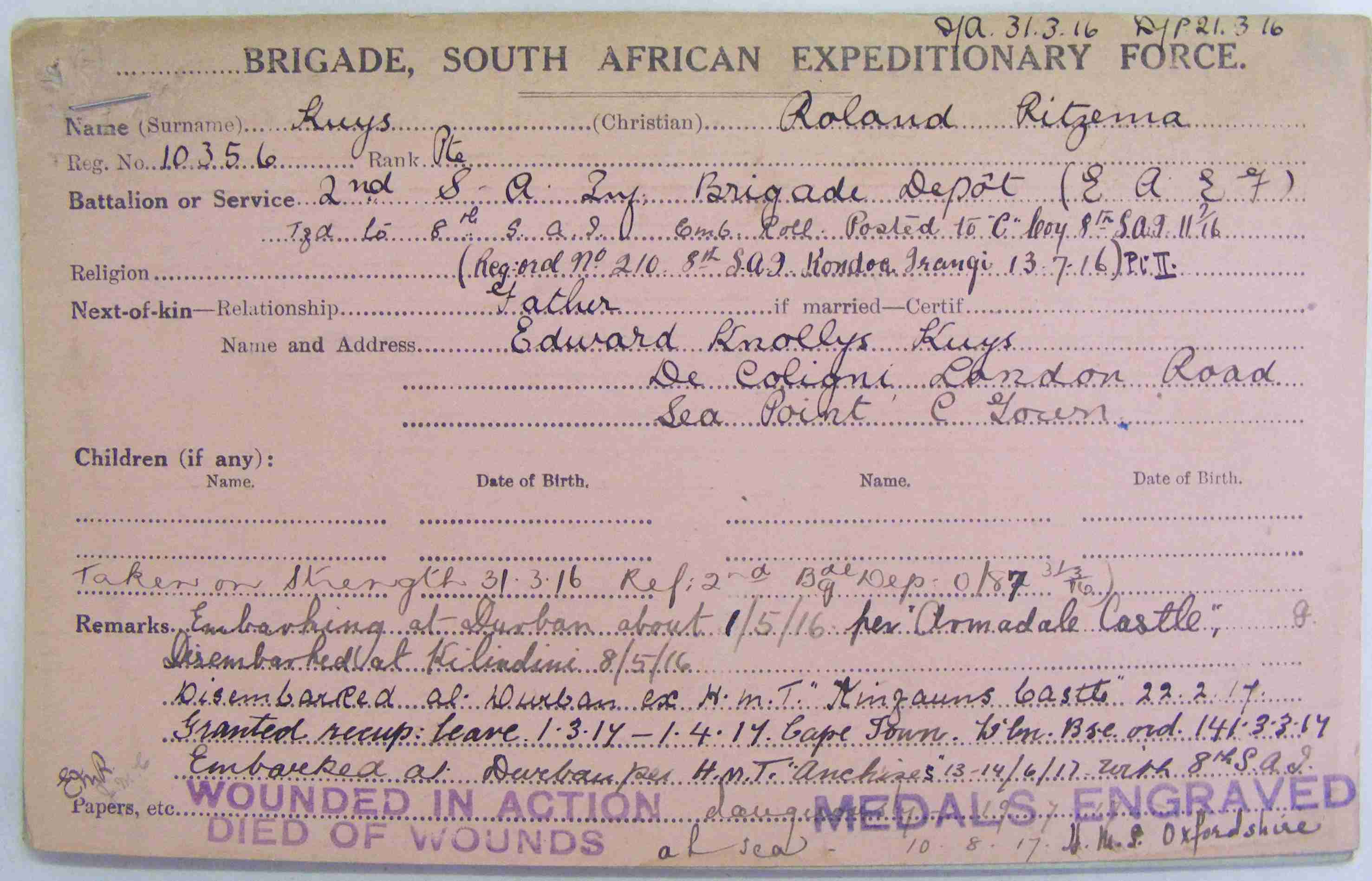 Son of Edward K. and Barbara Kuys, of De Coligni, London Rd., Sea Point, Cape Province. Death plaque sold on bidorbuy for 670 Rand 14-May-2007. Born in Cape Town, South Africa, attested on 31st March 1916 to the 2nd SAI Brigade Depot. In July he was transferred to "C" company 8th South African Infantry and eight days later during action, he received a G.S.W to the spine and was admitted to hospital in Dar Es Salaam, where he was described as dangerously ill. Kuys was transferred to H.M.S Oxfordshire, but died and was buried at sea |