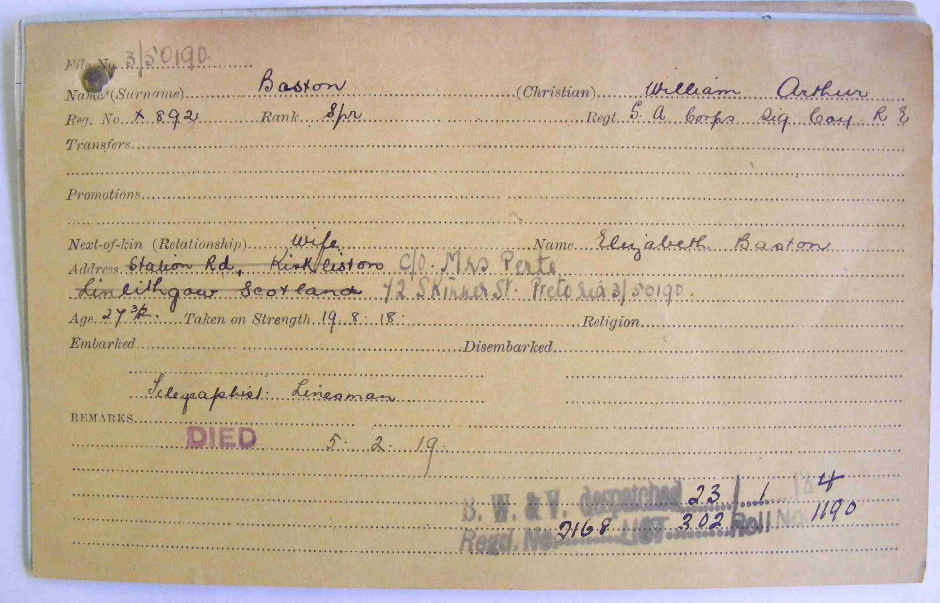 Husband of Elizabeth Baston, of Central Prison Reserve, Pretoria.