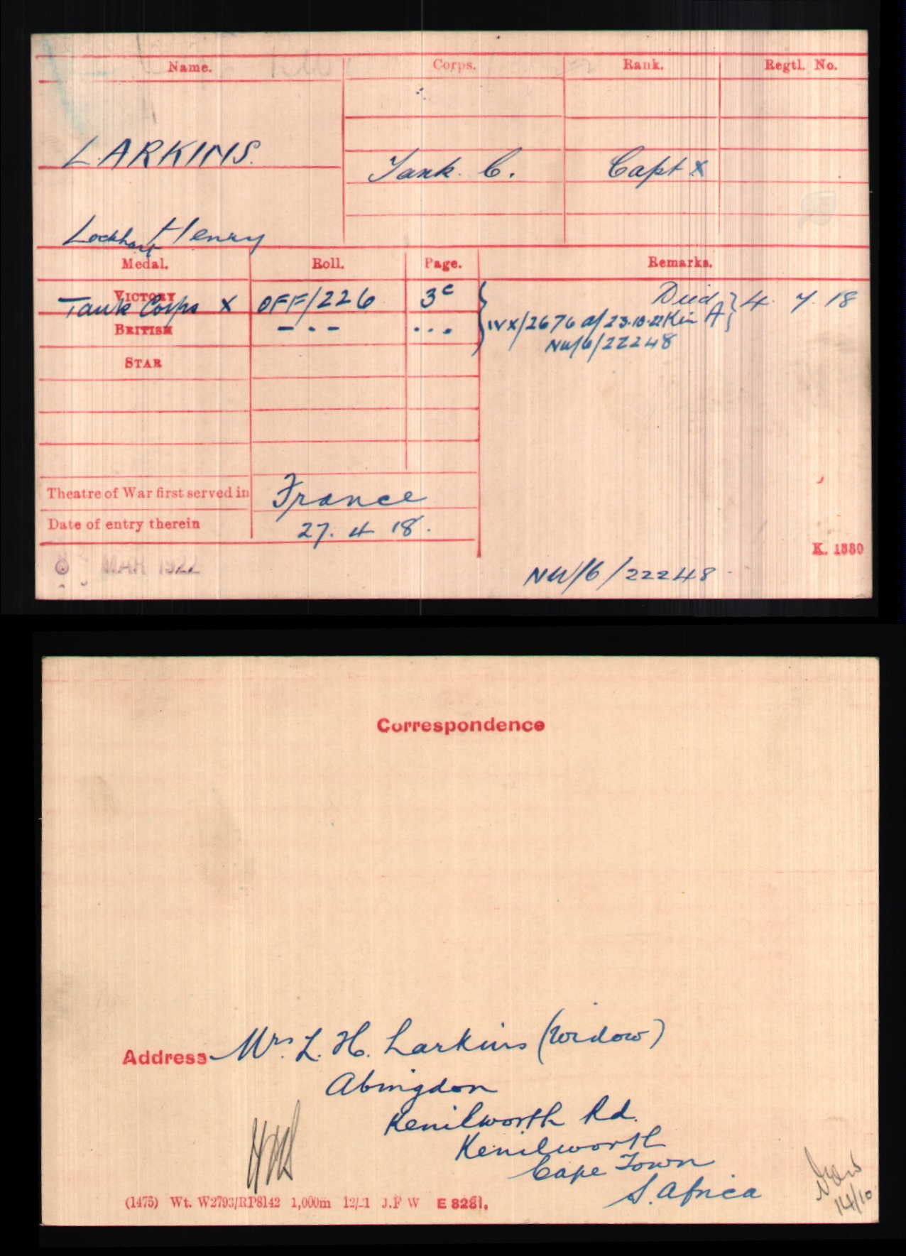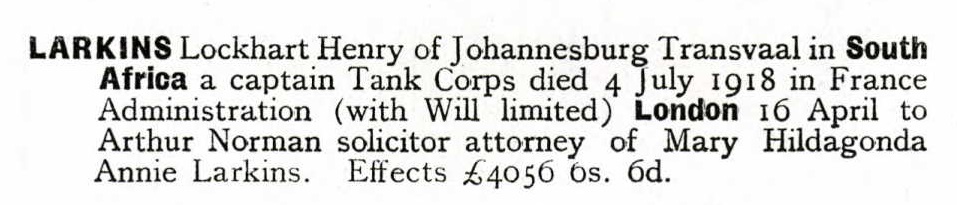 Son of John Burton Larkins and Georgina Valiant Larkins; husband of M. H. Larkins, of "Abingdon," Kenilworth Rd., Kenilworth, Cape Province, South Africa. Born in England. Served as Lieut. in R.N.V.R. in the Aegean; also in South African Campaign with I.L.H.