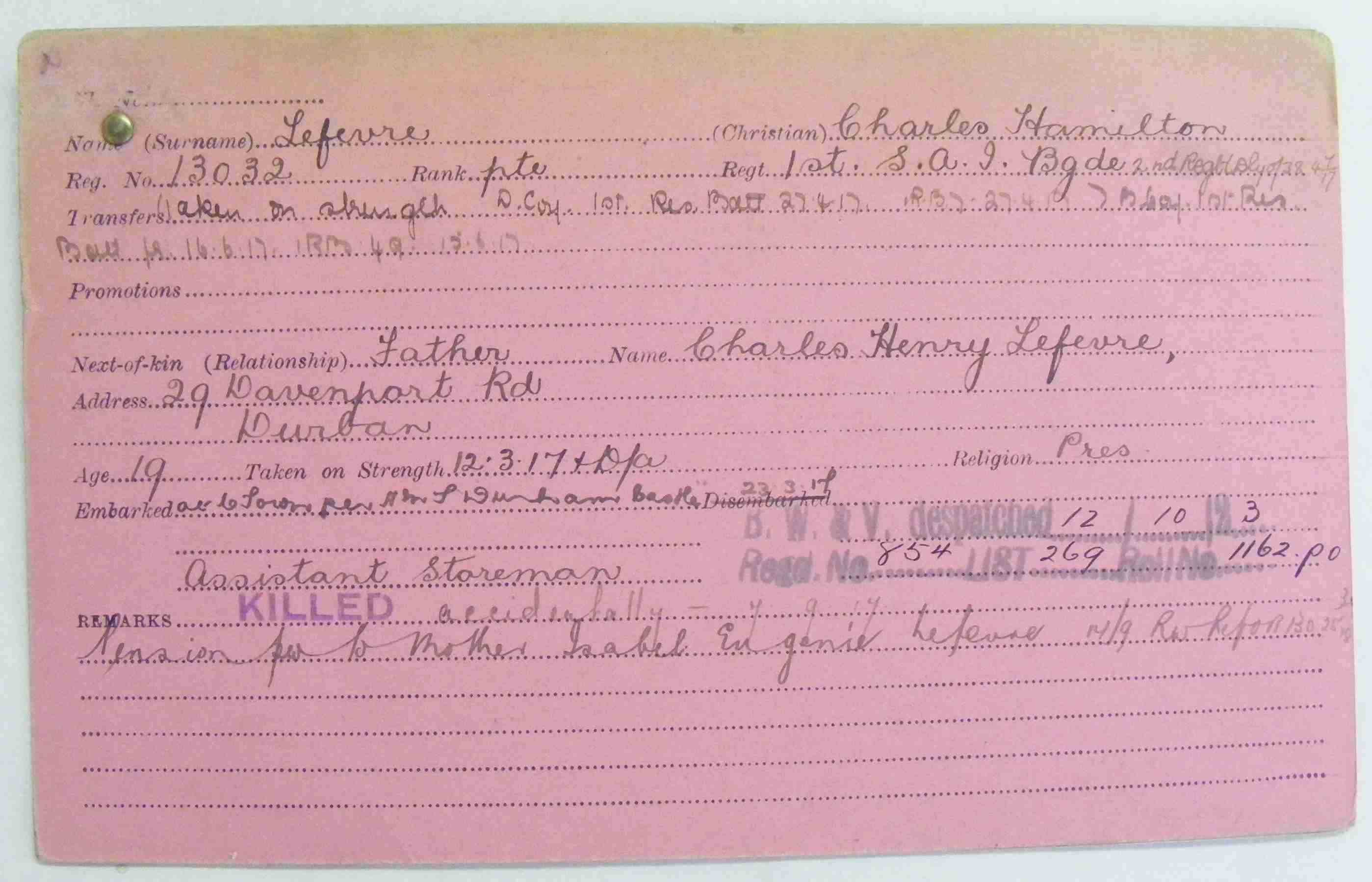 Son of Chales Henry and Mabel Eugenie Lefevre, of 96, Windermere Rd., Durban, Natal.