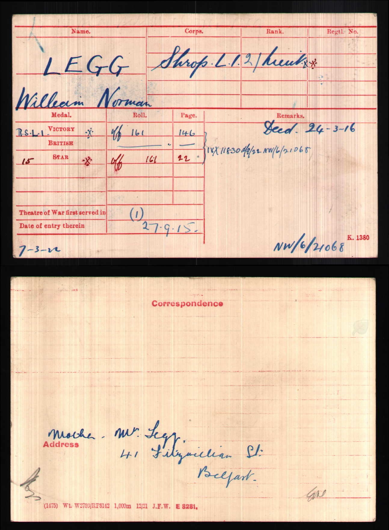 Son of John and Sarah Ann Legg, of 41, Fitzwilliam St., Belfast. Native of Belfast. ref. South African Roll of Honour 1914-1918