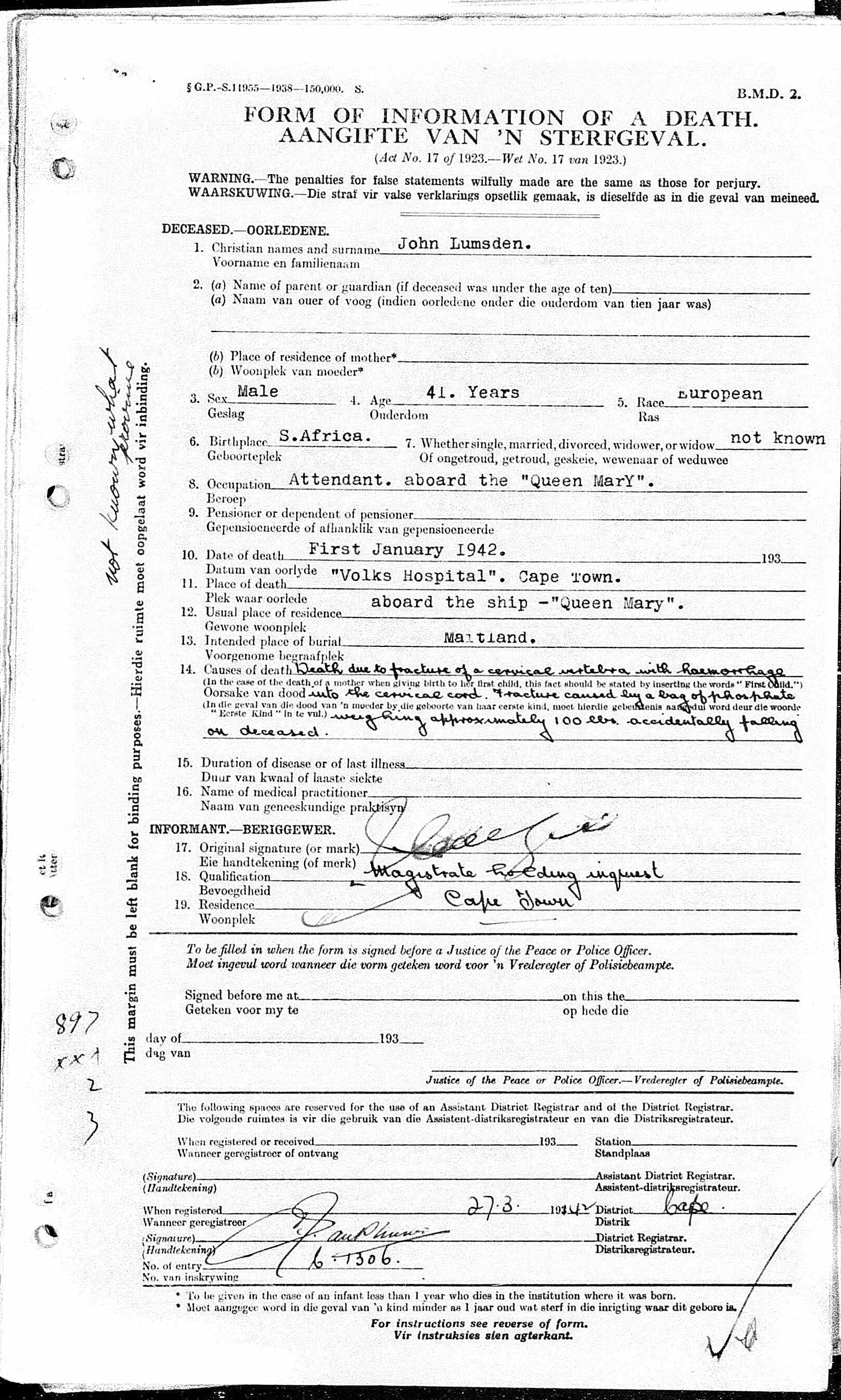 Died of spinal injuries, received in service of ship 29 December 1941, at 6.am in hospital, Cape Town. Bag of phosphate weighing 100 lbs was dropped on him. |