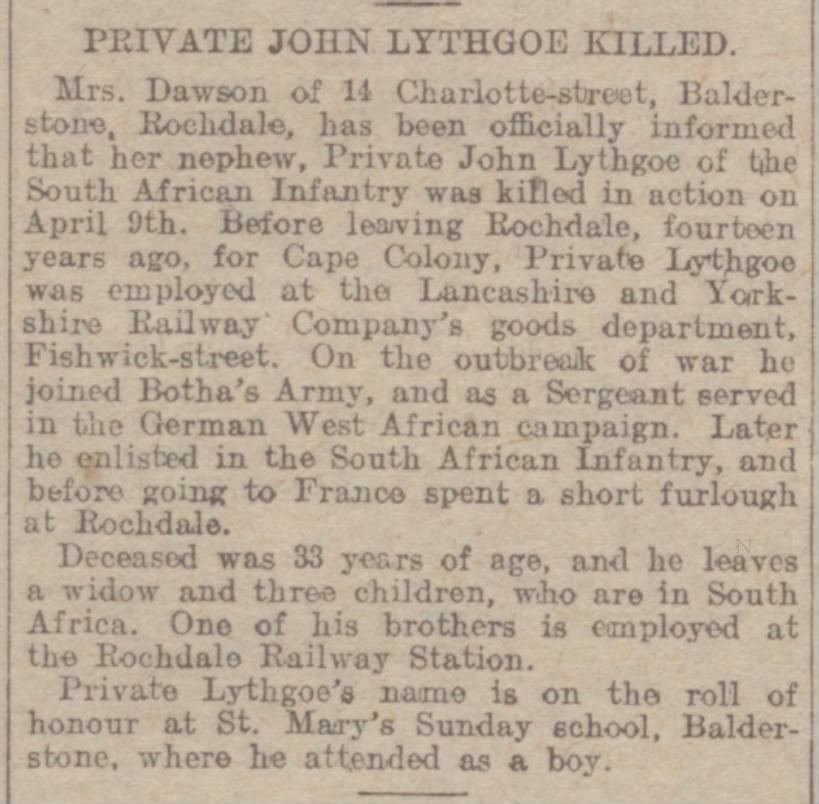 Husband of Sarah J. Lythgoe, of 19, Essex St., Woodstock, Cape Province, South Africa. Native of Rochdale, England.