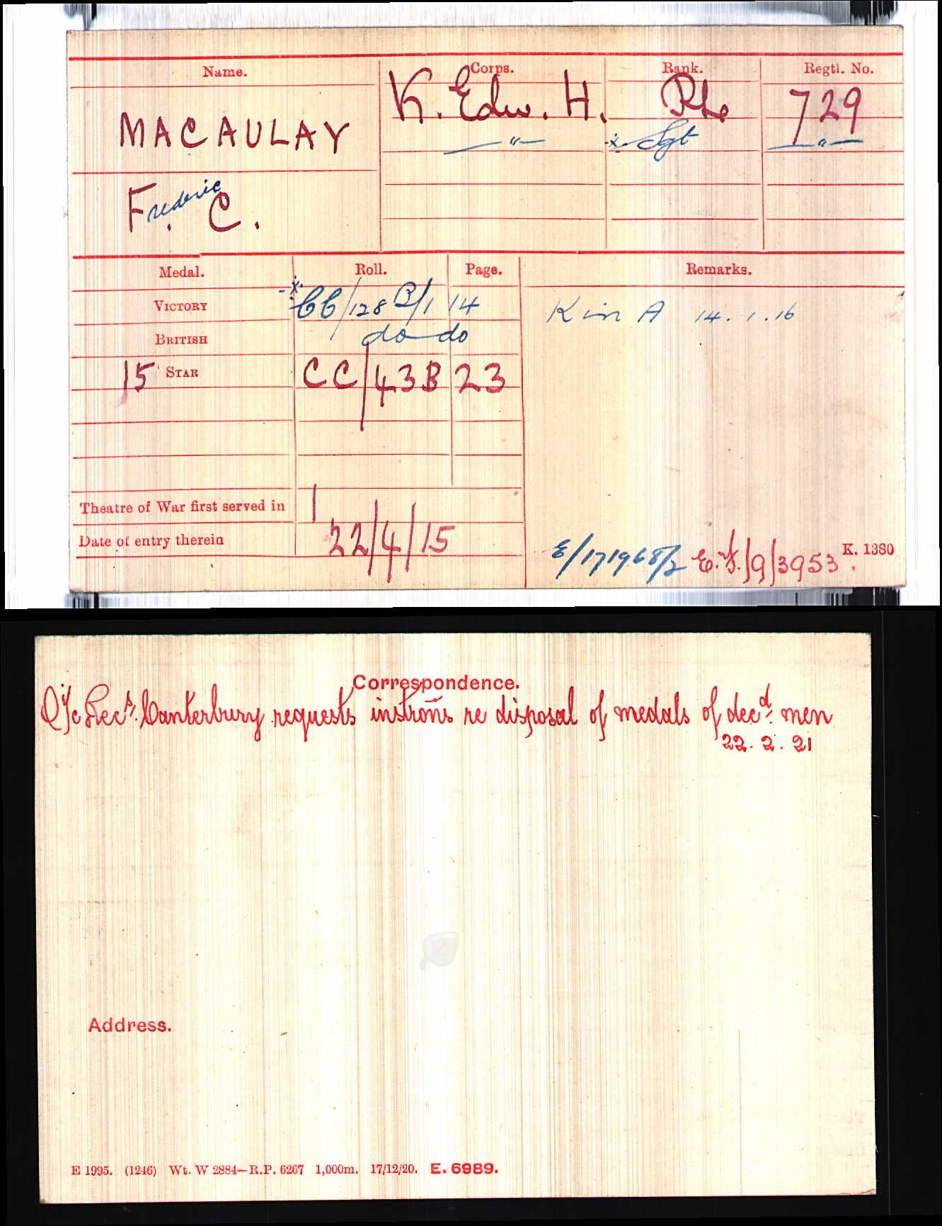 Son of Colonel Charles Edward Macaulay (Probyn's Horse) and Frederica Julia Pollock Macaulay; husband of Mary Adelaide Macaulay, of Crown's, Ugley, Essex. The youngest of three brothers, all of whom were killed in action. ref. South African Roll of Honour 1914-1918
