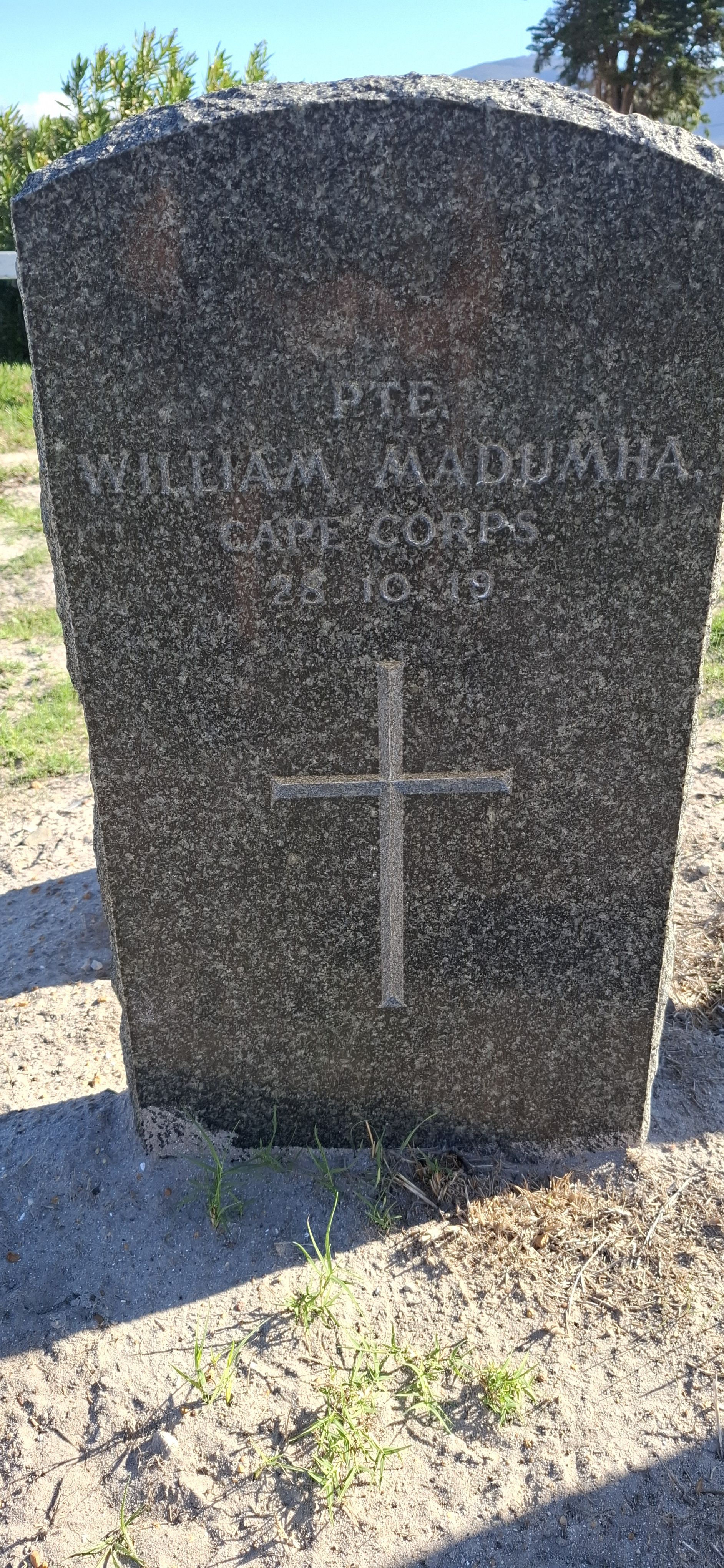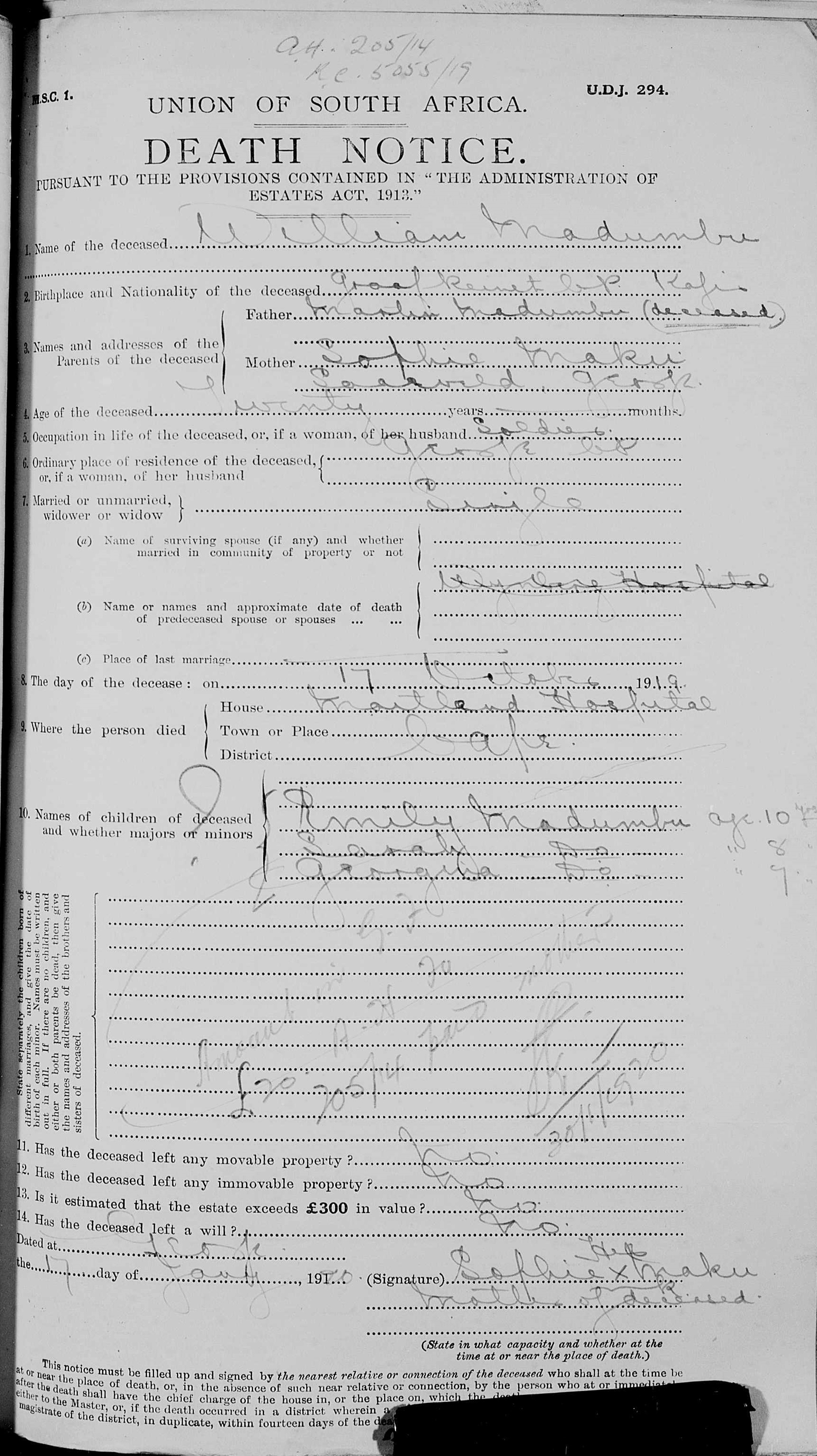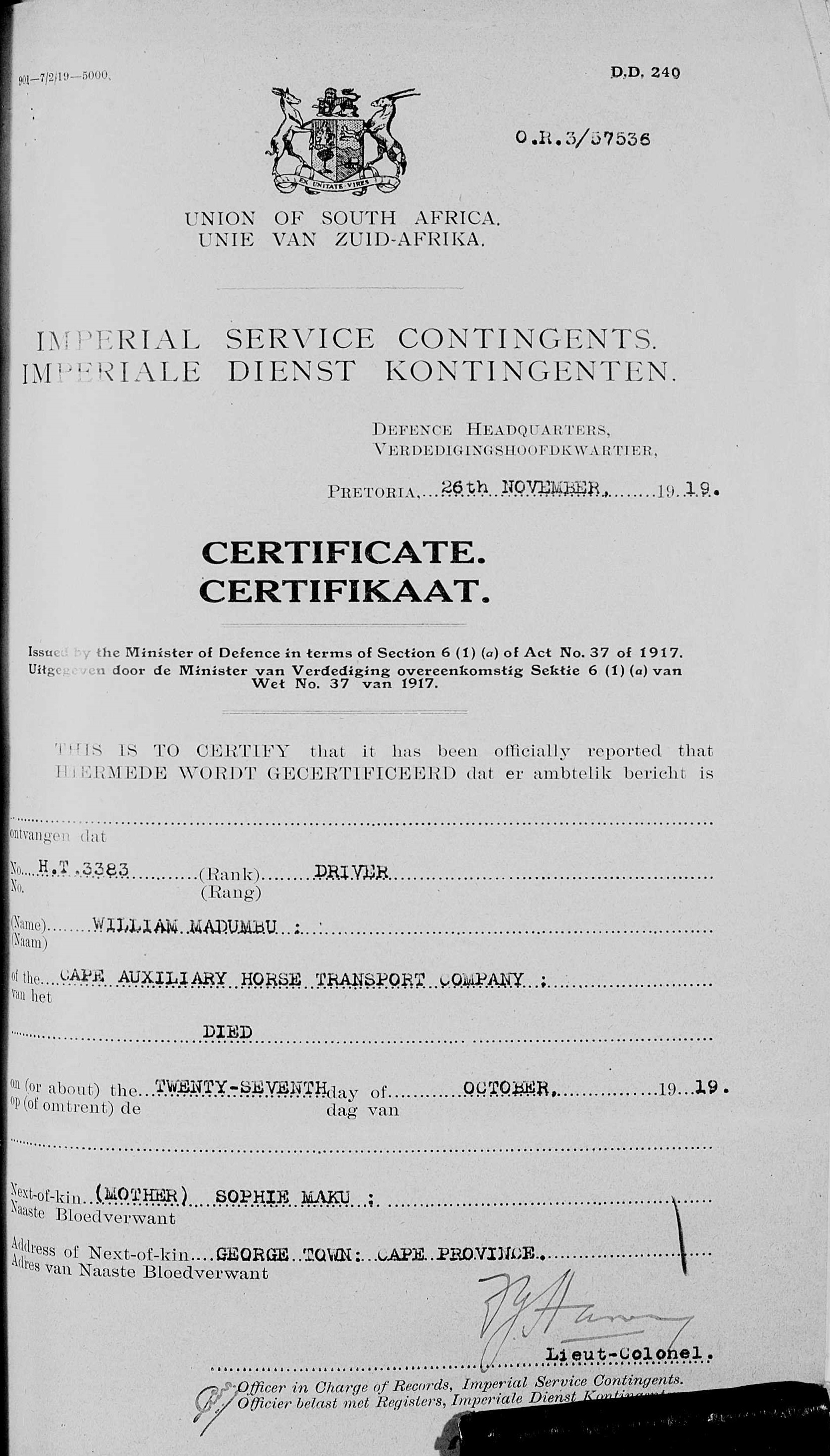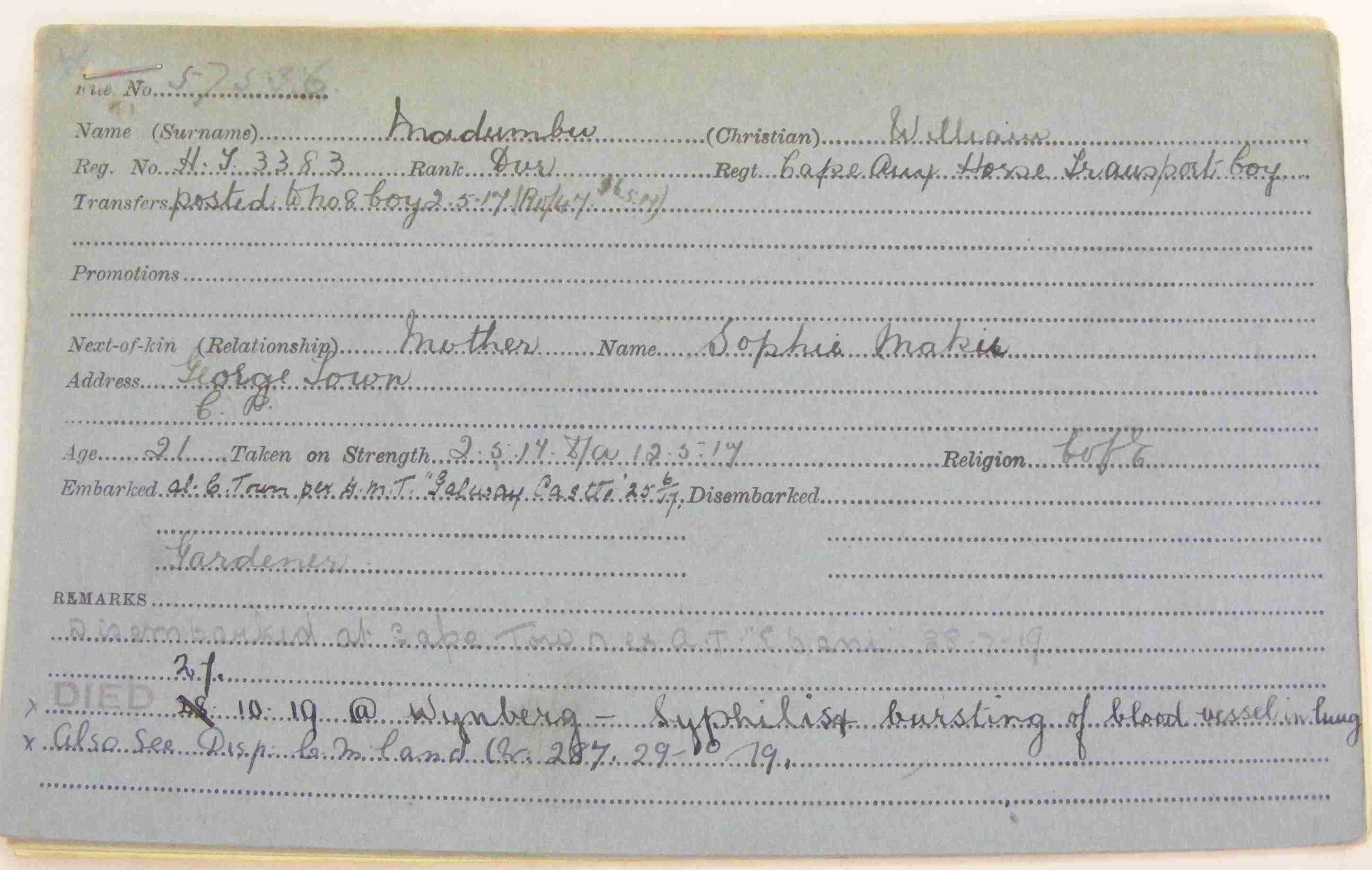Son of Sophie Maku, of George, Cape Province. Attested 2 May 1917. Service in German South West Africa. Repatriated on the "Ebani" on 4 July 1919 as a result of tuberculosis of lungs |