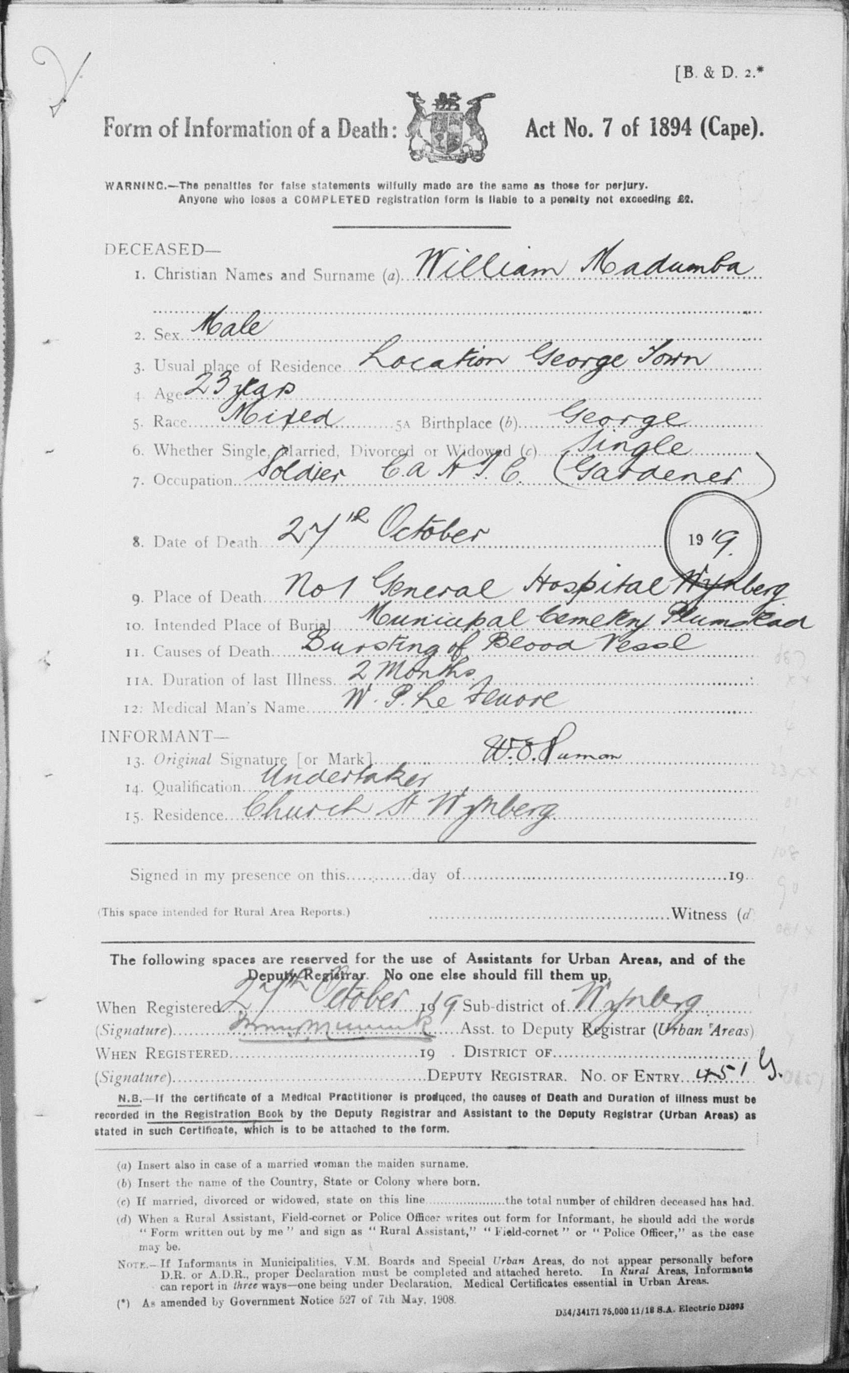 Died of syphilis and bursting of blood vessel, at Wynberg |