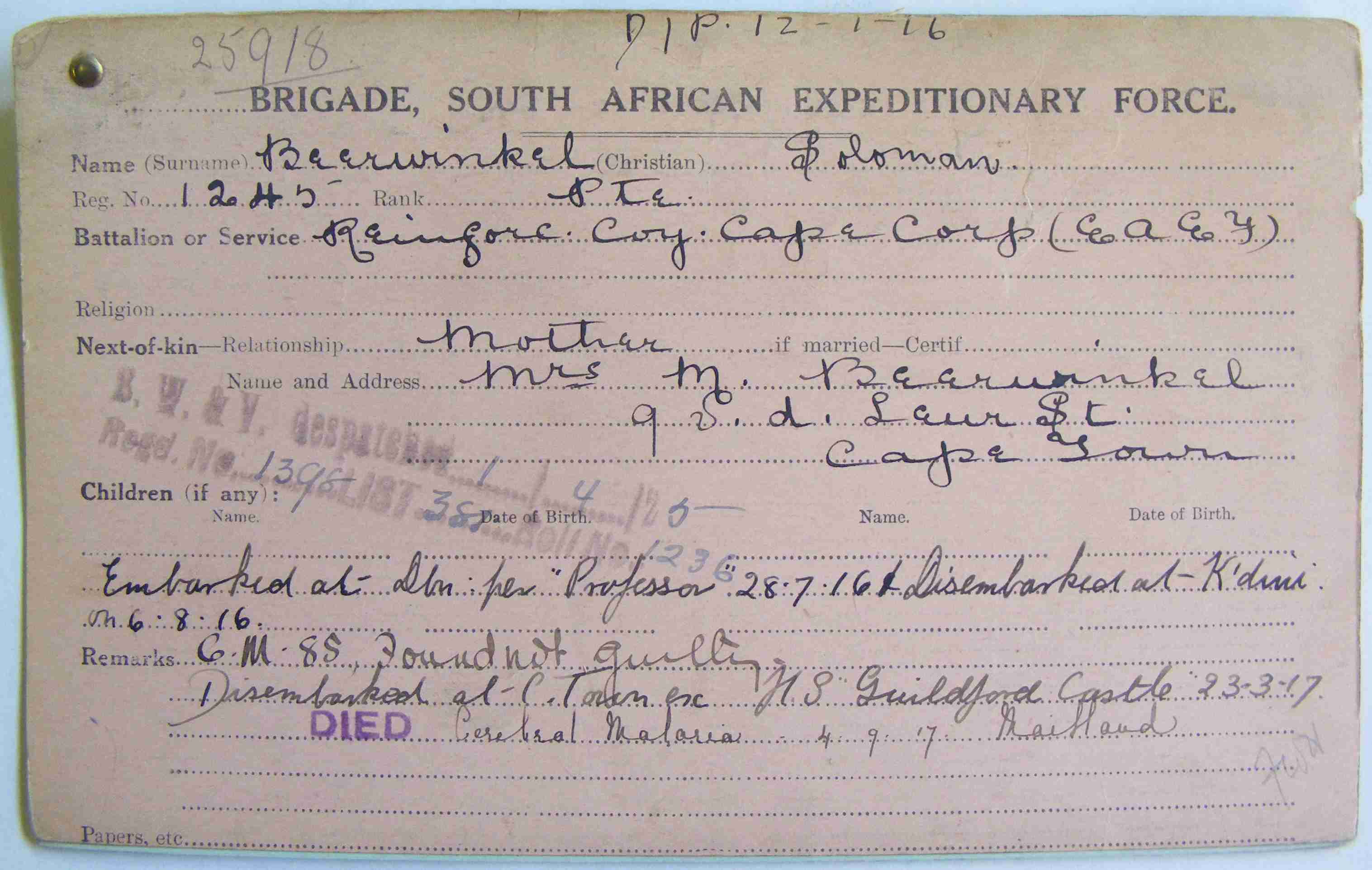 Son of Gideon and Maria Beerwinkel, of 47, Preswich St., Cape Town.