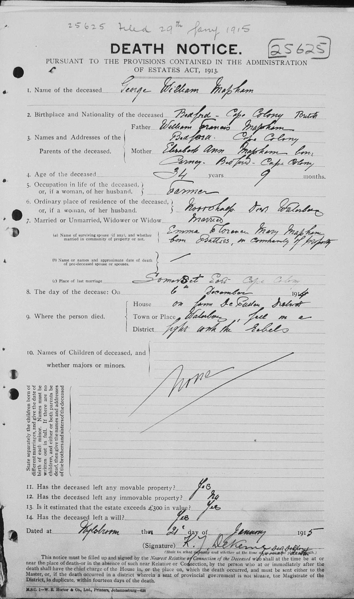 Son of William Francis and Elizabeth Annie (nee Carney) Mapham, of Fair View, Hulton Street, Bedford. Husband of Emma Florence Mary (born Battiss) Mapham. Served as a Trooper with Nesbitt's Horse in the ABW 1899 ? 1902. A farmer. Served with Geyser's Commando in the Afrikaner Rebellion 1914. His father also served with Nesbitt's Horse in the ABW. Commemorated on the Bedford, Eastern Cape and Bedford Presbyterian Church WWI Memorials. His brother Walter Leslie Mapham also died in service |