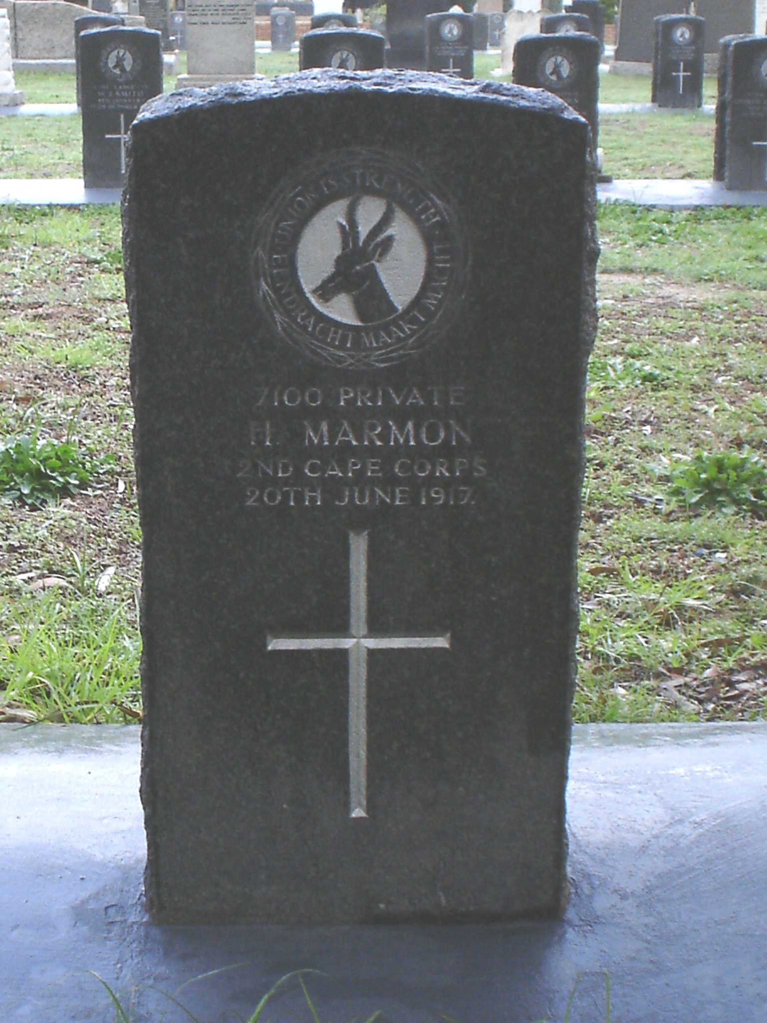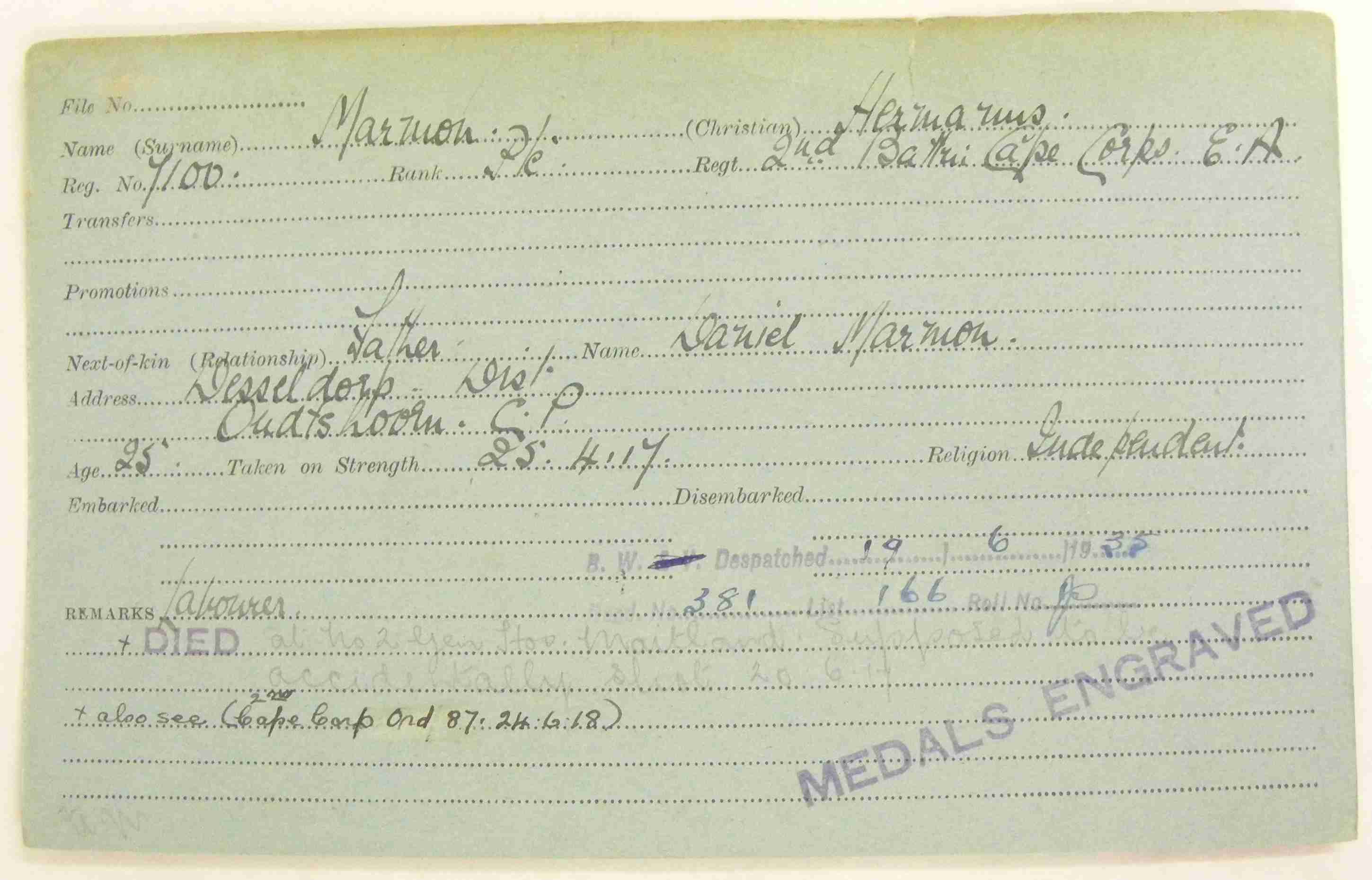 Son of the late Daniel and Katrina Marmon. Born at Dysselsdorp, Oudtshoorn, Cape Province.