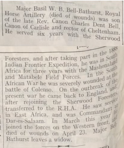 Son of Reverend Canon Charles Dent Bell, Canon of Carlisle and rector of Cheltenham. Husband of Elizabeth Bell-Bathhurst, of 99 Westbourne Terrace, Hyde Park, W. Served six years with the Sherwood Foresters, and after taking part in the 1888 Indian Frontier Expedition, he was in South Africa for three years with the Mashonaland and Matabele Field Forces. In the South African War he was severely wounded at the battle of Colenso. On the outbreak of the present war he came back to England, and after rejoining the Sherwood Foresters, transferred to R.H.A. He saw service in East Africa, and was Commandant at Dar-es-Salaam. In March this year he joined the forces on the Western Front. ref. South African Roll of Honour 1914-1918 |