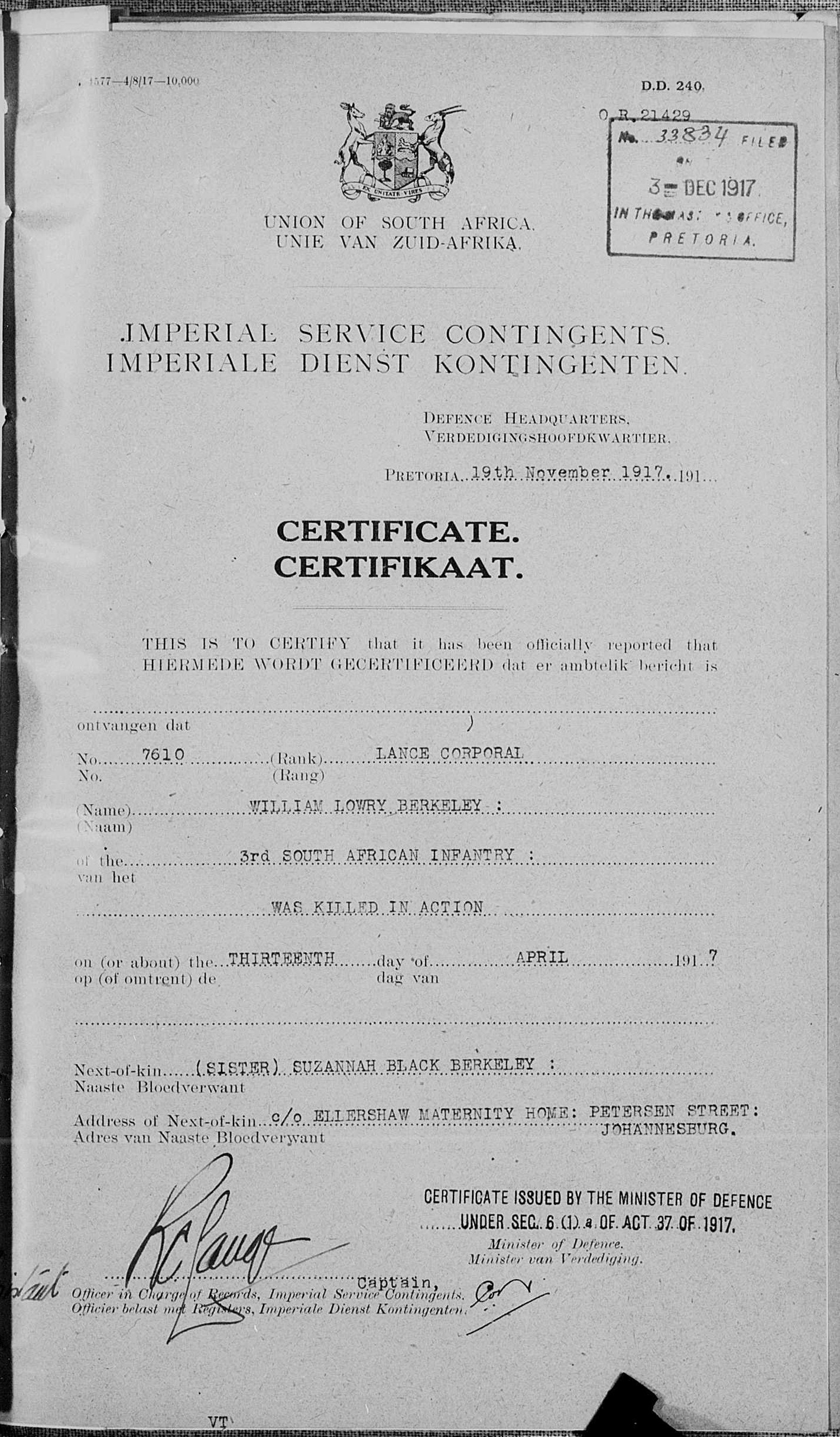 Son of William Lowry and Margaret Berkeley, of Belfast, Ireland.