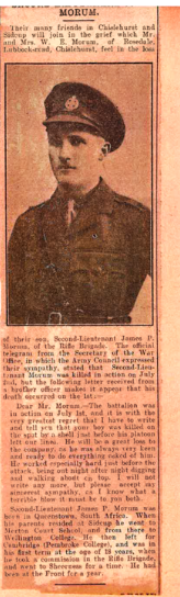 Son of William Ernest and Florence Sarah Morum, of Queenstown, Cape Colony, South Africa. Born Queenstown. Educated Merton Court Prep School, Sidcup, London; Combermere House, Wellington College 1910-1913 & Pembroke College, Cambridge University 1914. Commemorated on Queenstown Methodist Church; Queenstown; Merton Court Prep School; Wellington College, Berkshire & Pembroke College, Cambridge University WWI Memorials. |