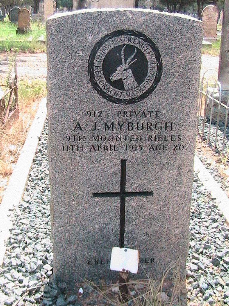 Son of Mr. S. and Mrs. C. J. Myburgh, of Drogedam, Strydenburg, Cape Province. Born Hopetown. A farmer.