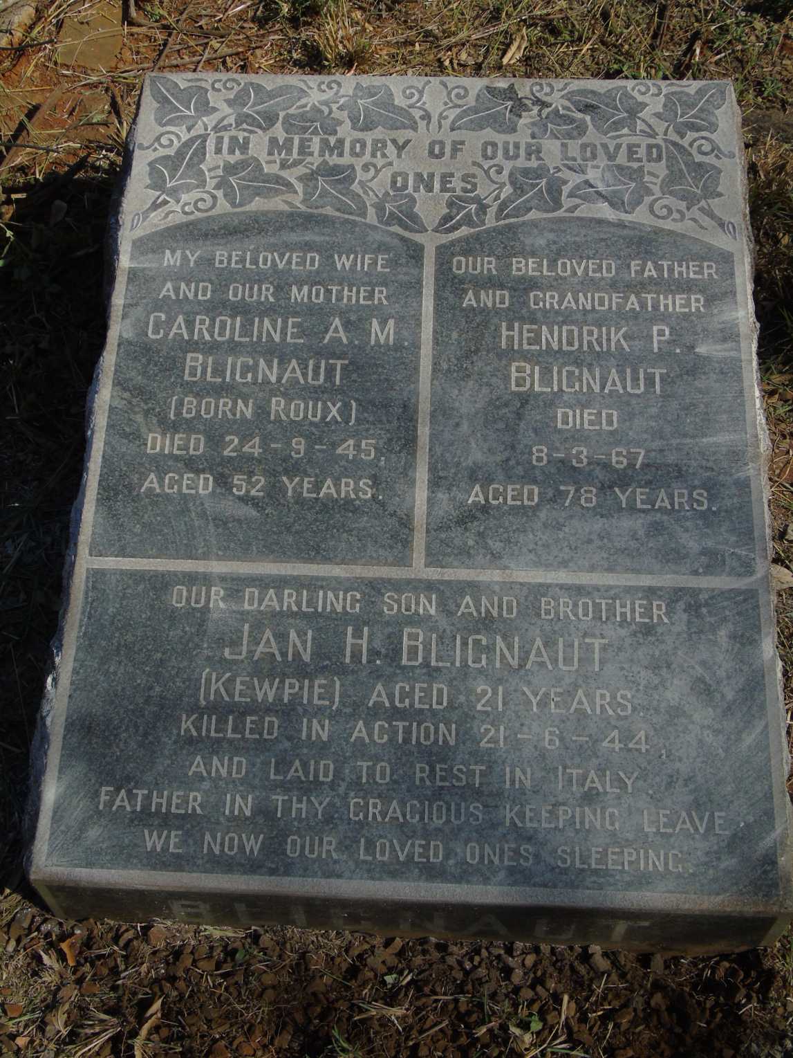 Son of Hendrik Petrus and Caroline Aletta Maria Blignaut, of 257 Jameson Park, Nigel, Transvaal. Born Pretoria. A scholar. He was unmarried. Commemoration stone in Pretoria (Rebecca Street) Cemetery |
