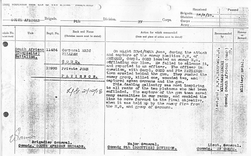 LG Sup 21 October 1918 - "On night 23 / 24 June, during the attack and capture of the enemy position S. W. of Meteren, Corporal Codd located an enemy M.G. enfilading our line. He failed to silence it, and reported to an officer. The officer in question, with Corporal Codd and Private Patience then crawled behind the gun. They rushed the enemy group, killed one, wounded two, and captured seven Germans and the gun. This dashing gallantry was most inspiring to all ranks of the two platoons who had been enfiladed. The capture of the gun team saved many casualties in our ranks, and enabled the line to move forward to the final objective, when it was held up by the enemy fire from the M.G. and group of Germans." |