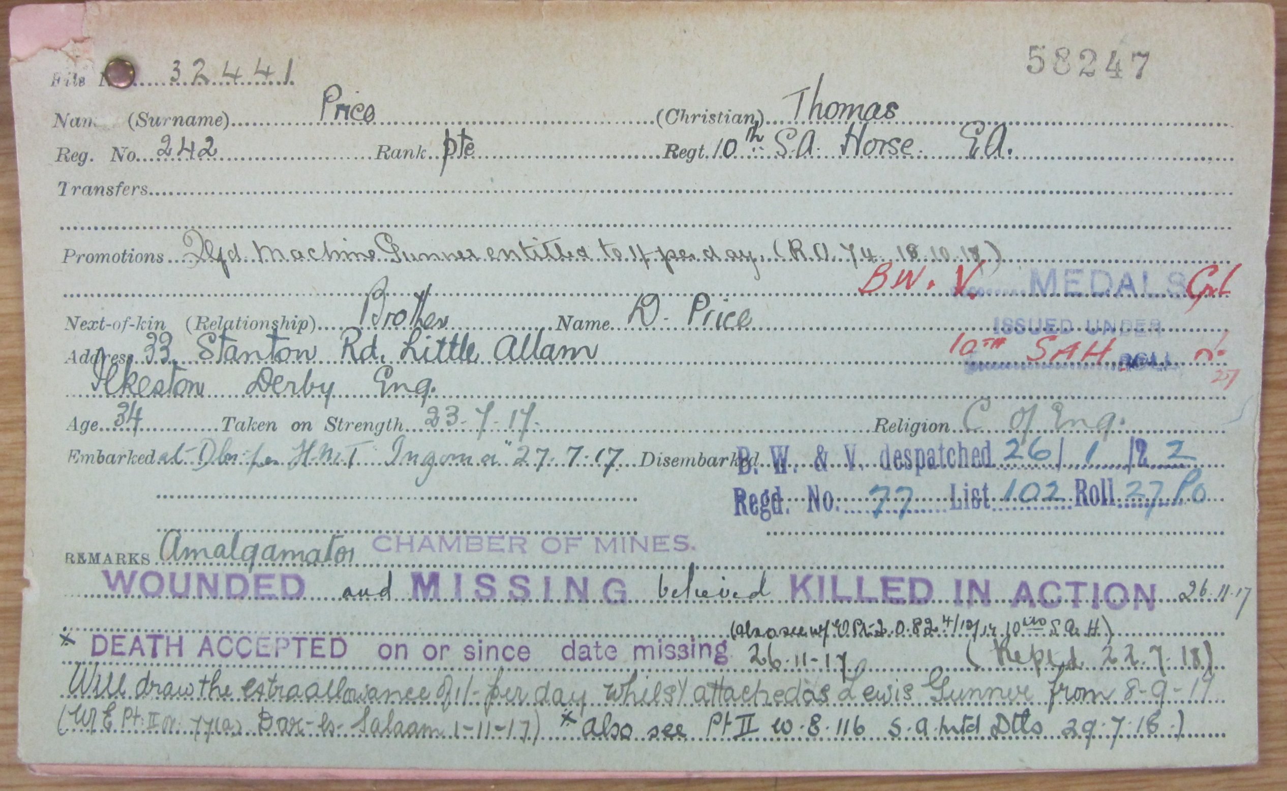 Son of Elizabeth Price, of Branslie Cottage, Ruabon, Wrexham, Denbighshire, and the late Thomas Price. Served in the South African Campaign, and Natal Rebellion (1906).