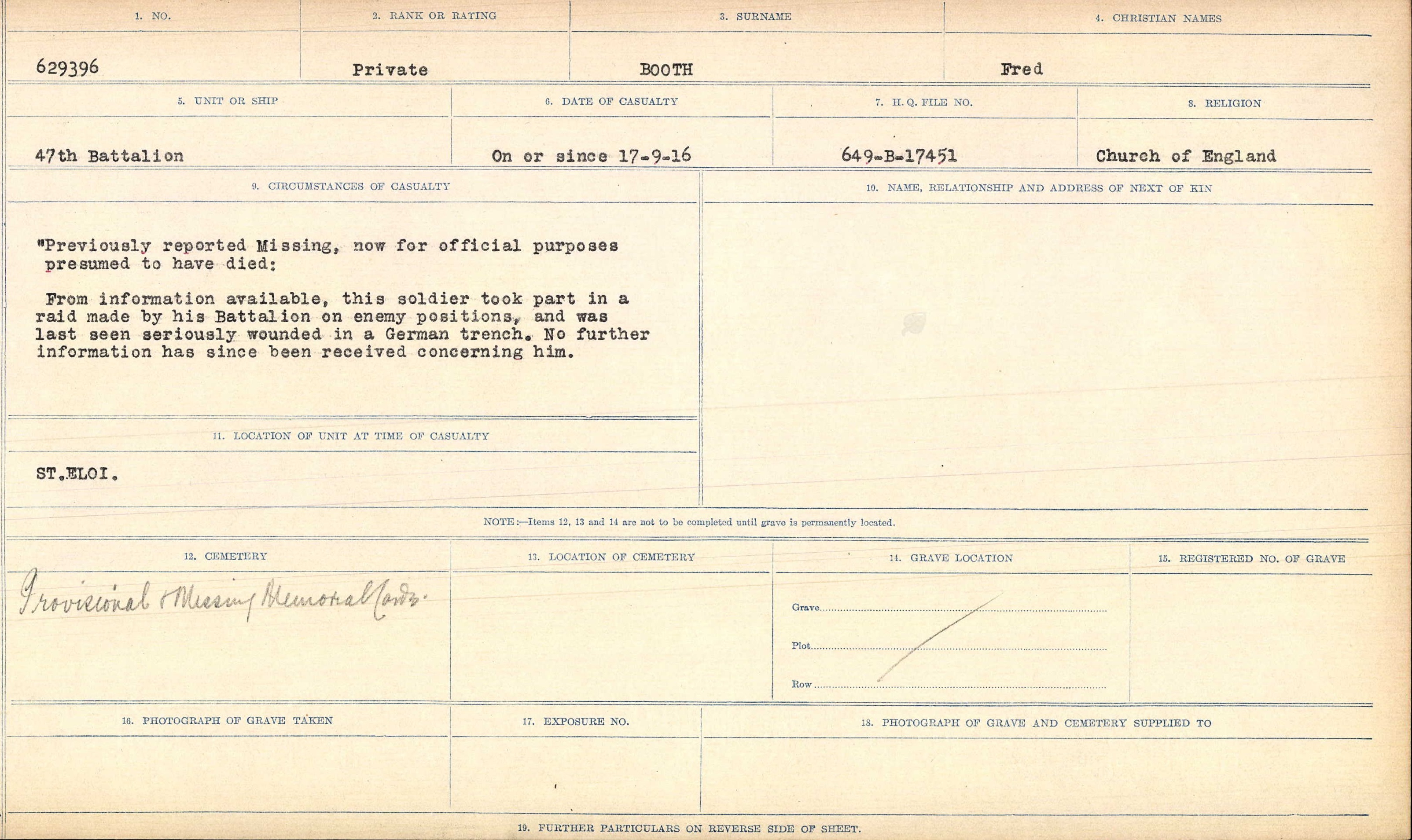 Killed in action, took part in a raid made by his Battalion on enemy positions, and was last seen seriously wounded in a German trench