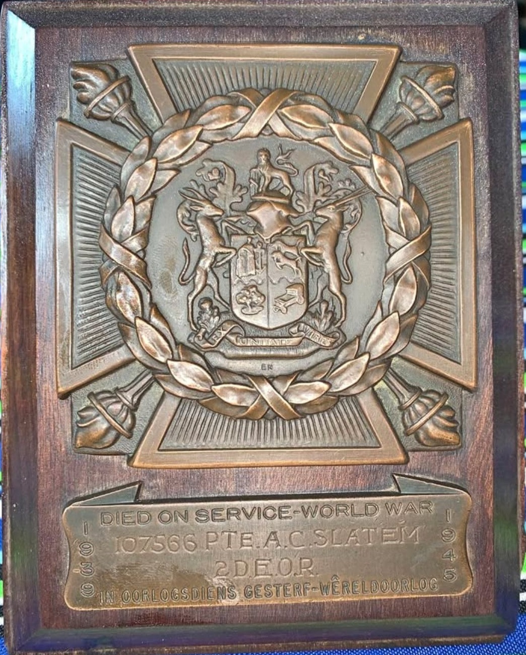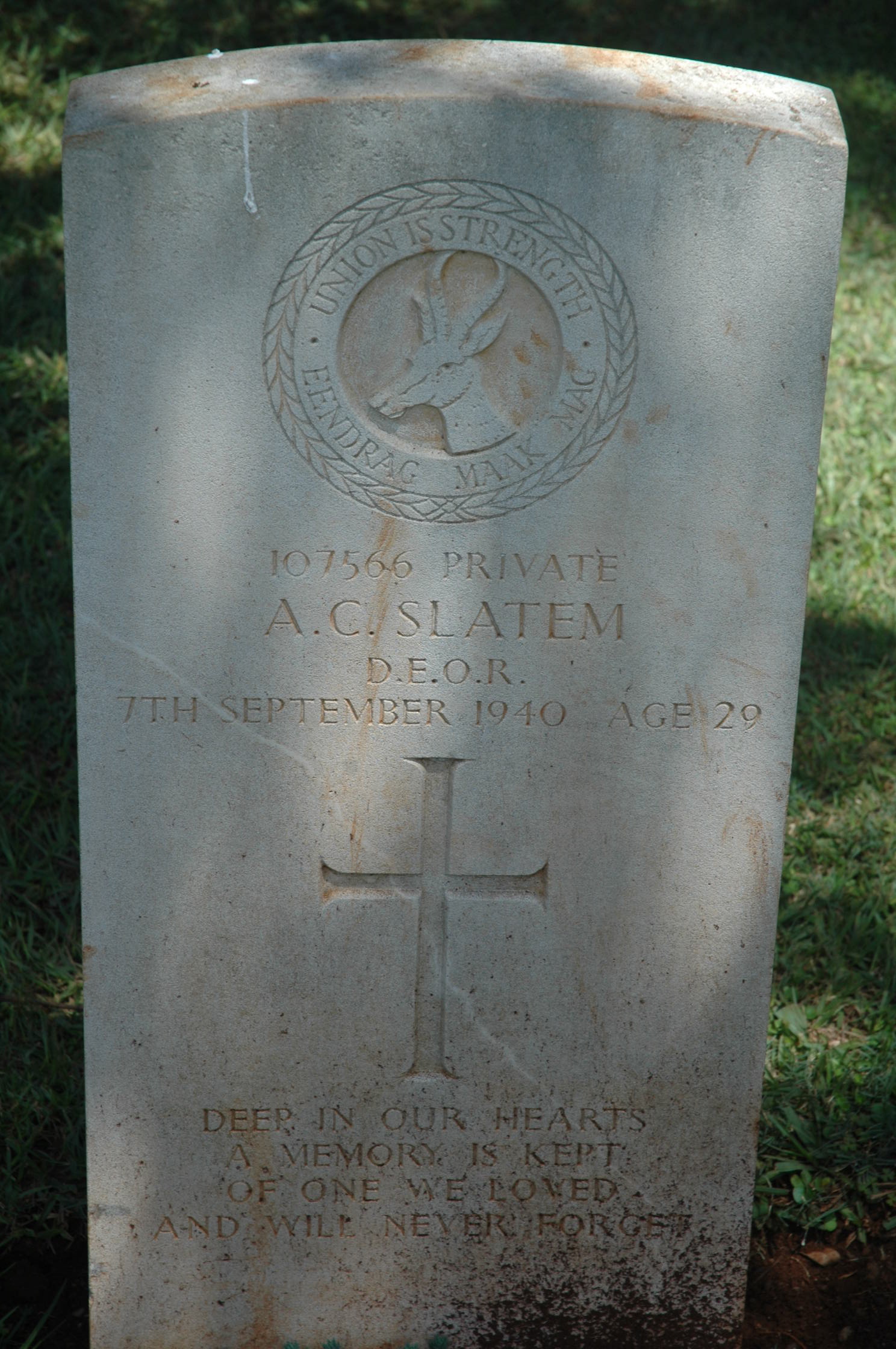 Son of Andrew C. and Cornelia Antoinetta Slatem, of Mowbray, Cape Town, South Africa; husband of Maria Wilhelmine Helene Slatem, of Mowbray, Cape Town. Born Mowbray, Cape Province. A confectioner.
