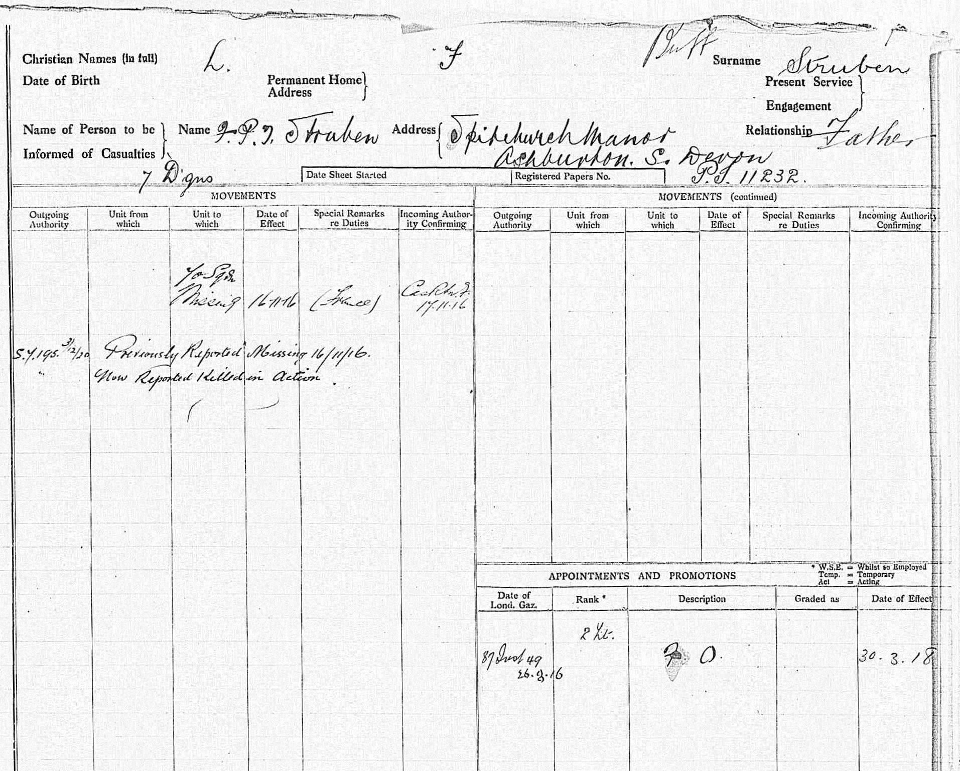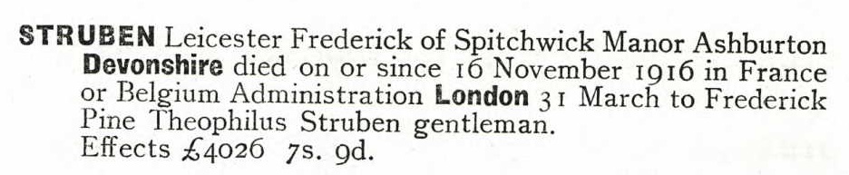 Son of Fred. P. T. and Mabel Struben, of Spitchwick Manor, Ashburton, Devon. ref. South African Roll of Honour 1914-1918