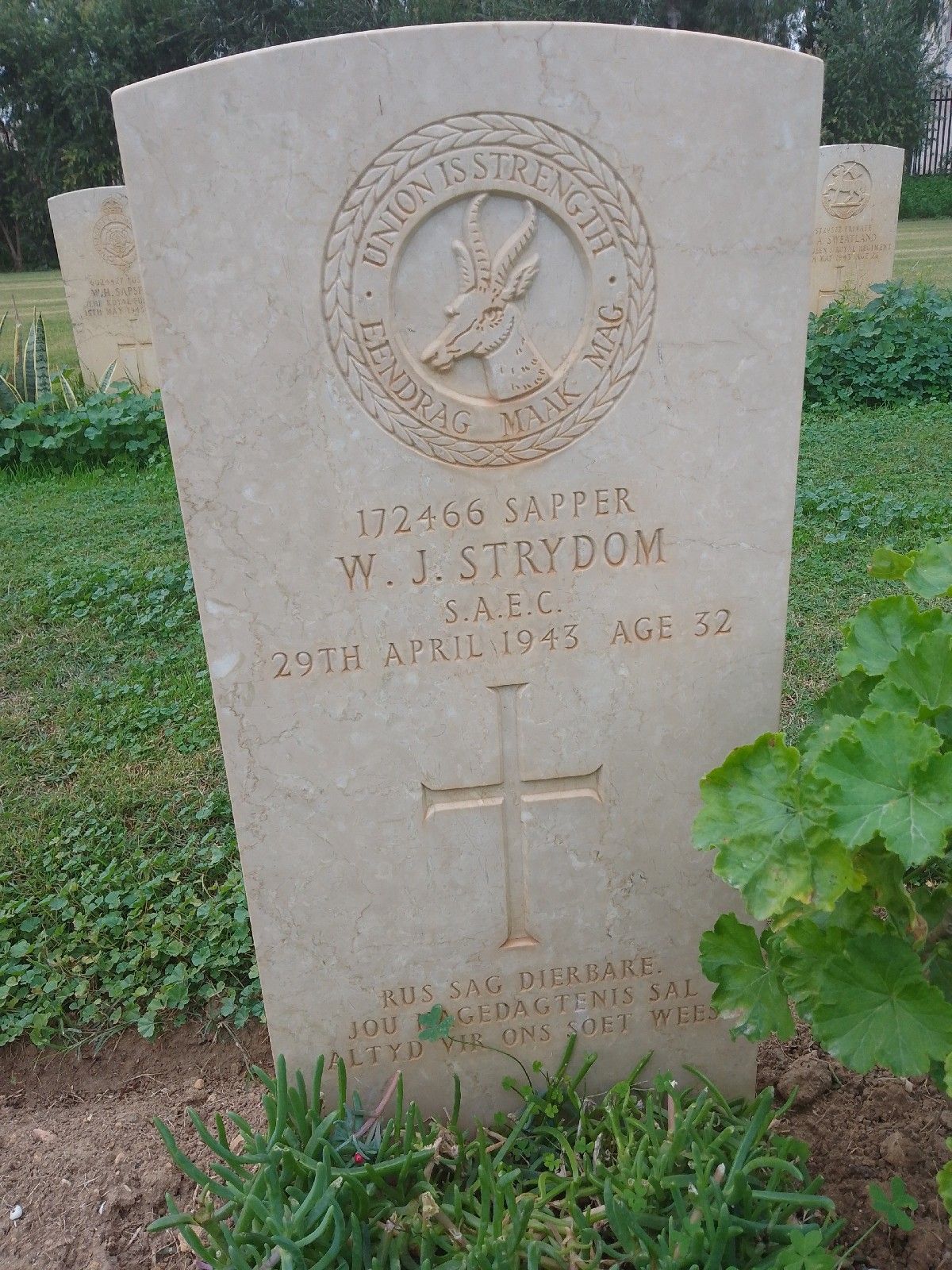 Son of Floris Abraham and Maria Magrietha Strydom, of Tonteldoos, P.O. Dullstroom. Husband of Elsie Magdalena Strydom, of Klipskool, Transvaal, South Africa. Born Bethal District.