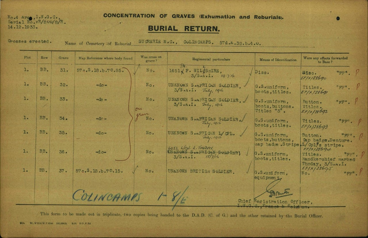 Found at Map Reference 57c.s.18.b.70.85 or GPS 50.0279, 2.8182. This is the Eastern edge of Delville Wood. One can assume he died during the fighting of July 1916. His means of identification were: G. S. uniform, boots, buttons, cap badge and Lance Corporal's stripe