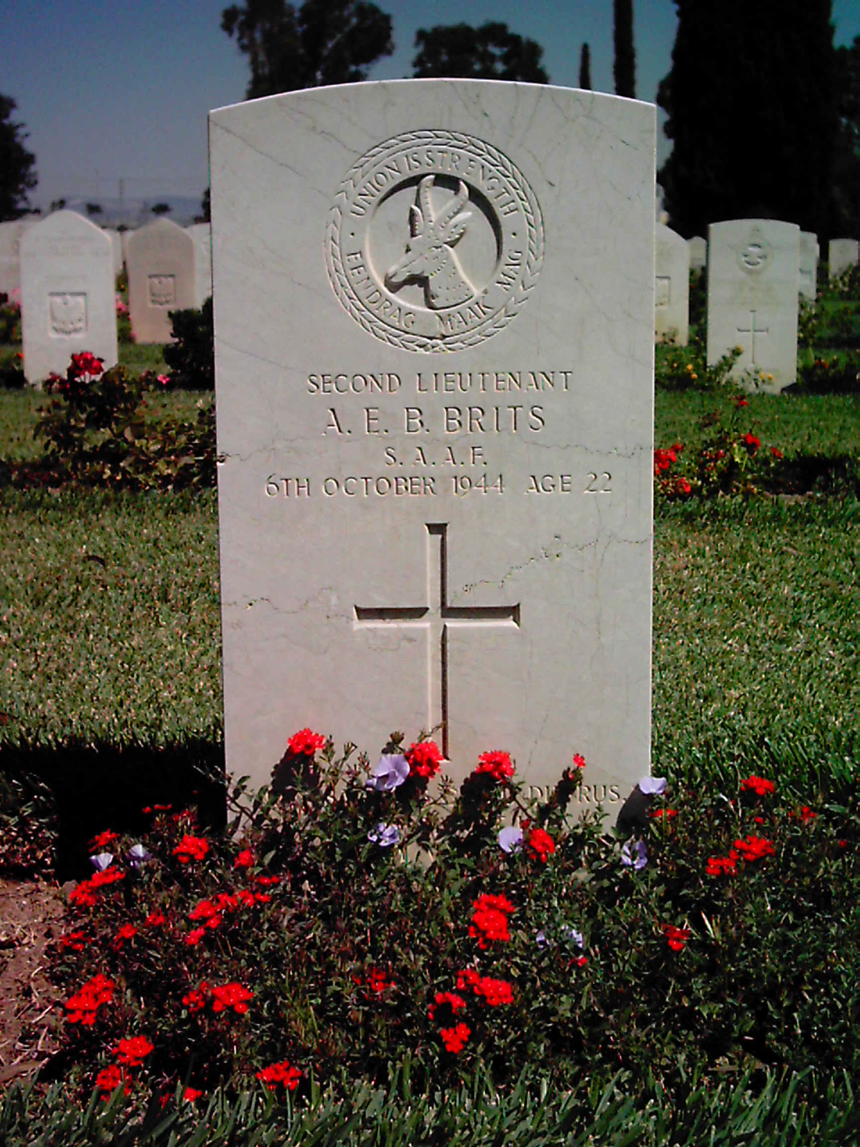 Son of David J. Brits and Gesina E. Brits; husband of Johanna Catharina Brits, of Groblersdal, Transvaal, South Africa. |