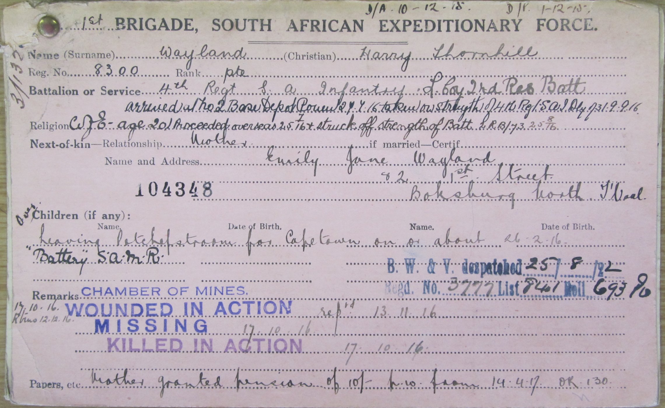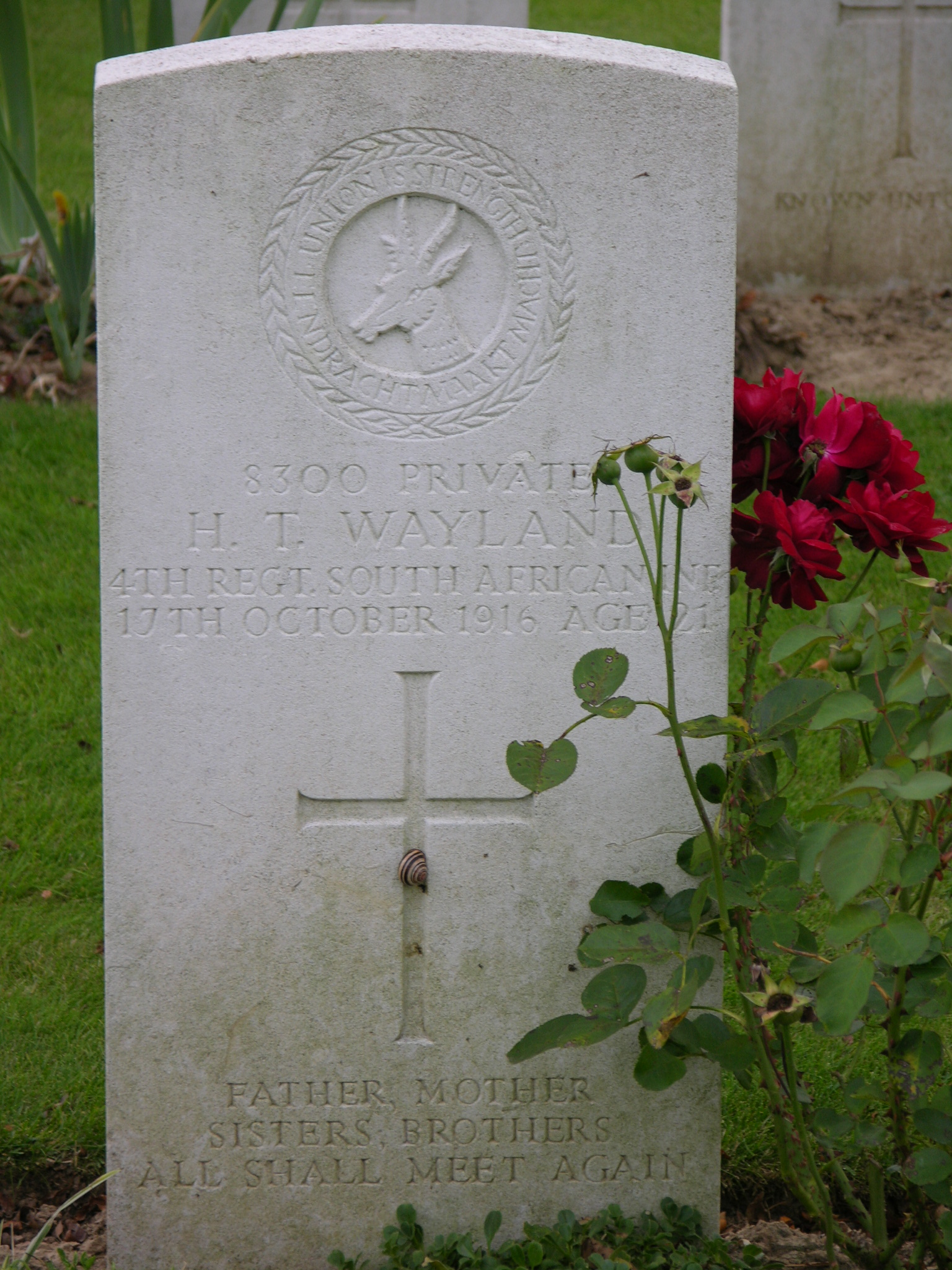 Son of Alfred Frederick and Emily Jane Wayland, of 450, Point Rd., Durban, Natal. Native of Barkly East, Cape Province. His brother also died on service