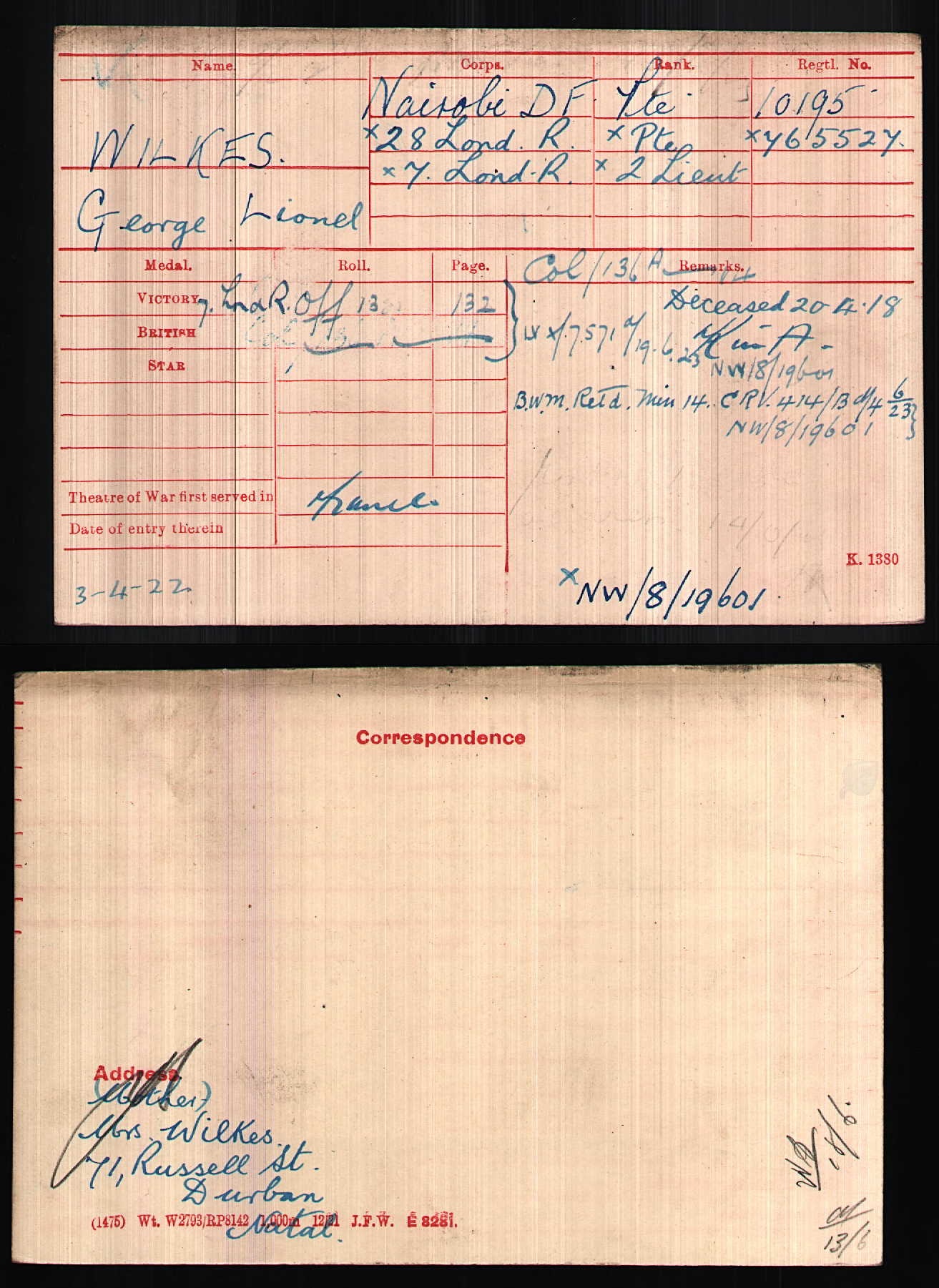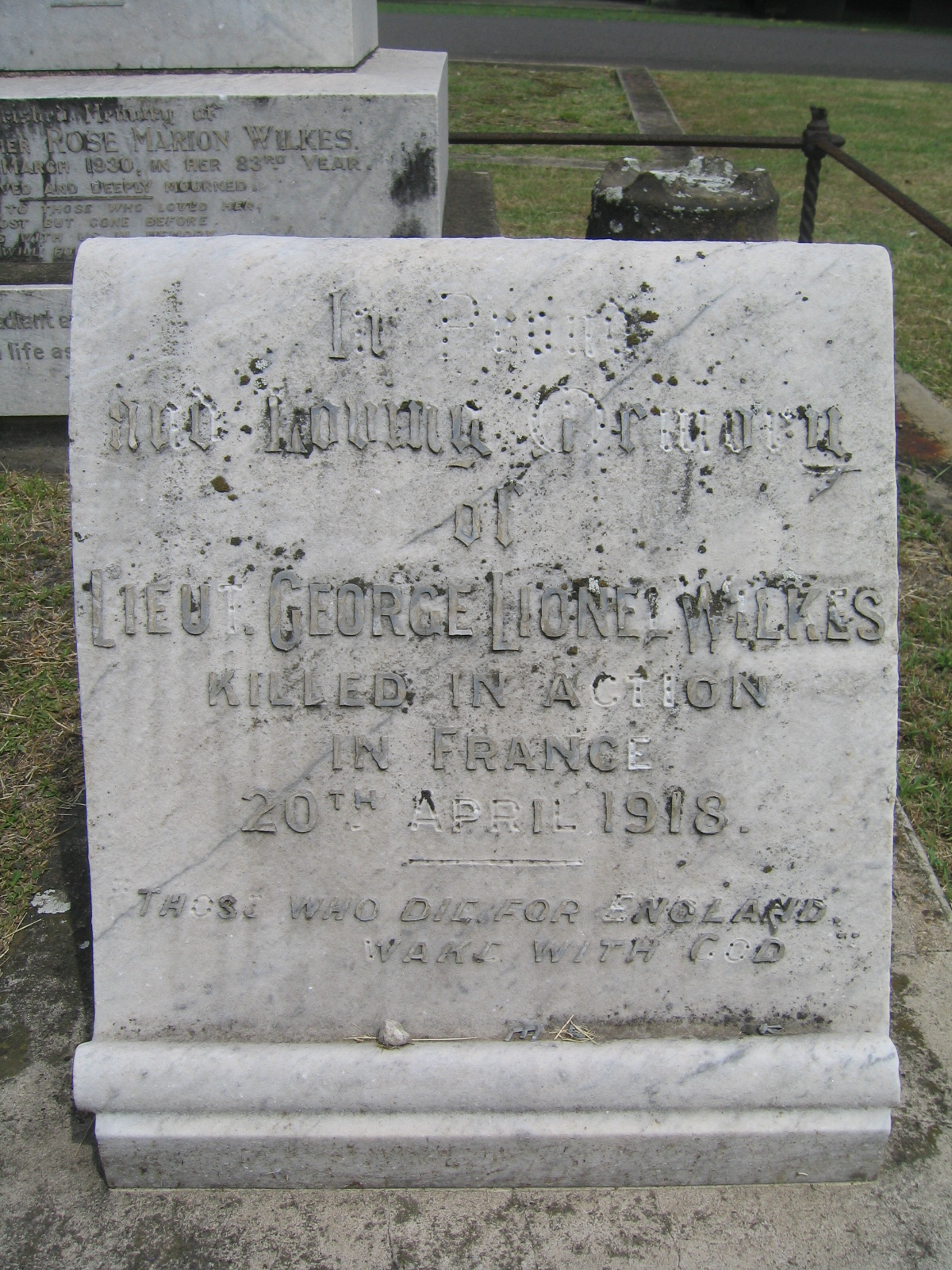 Son of Mrs. Rose Marion Wilkes, of 71, Russell St., Durban, Natal, South Africa. Commemoration stone in Durban (West Street) Cemetery.