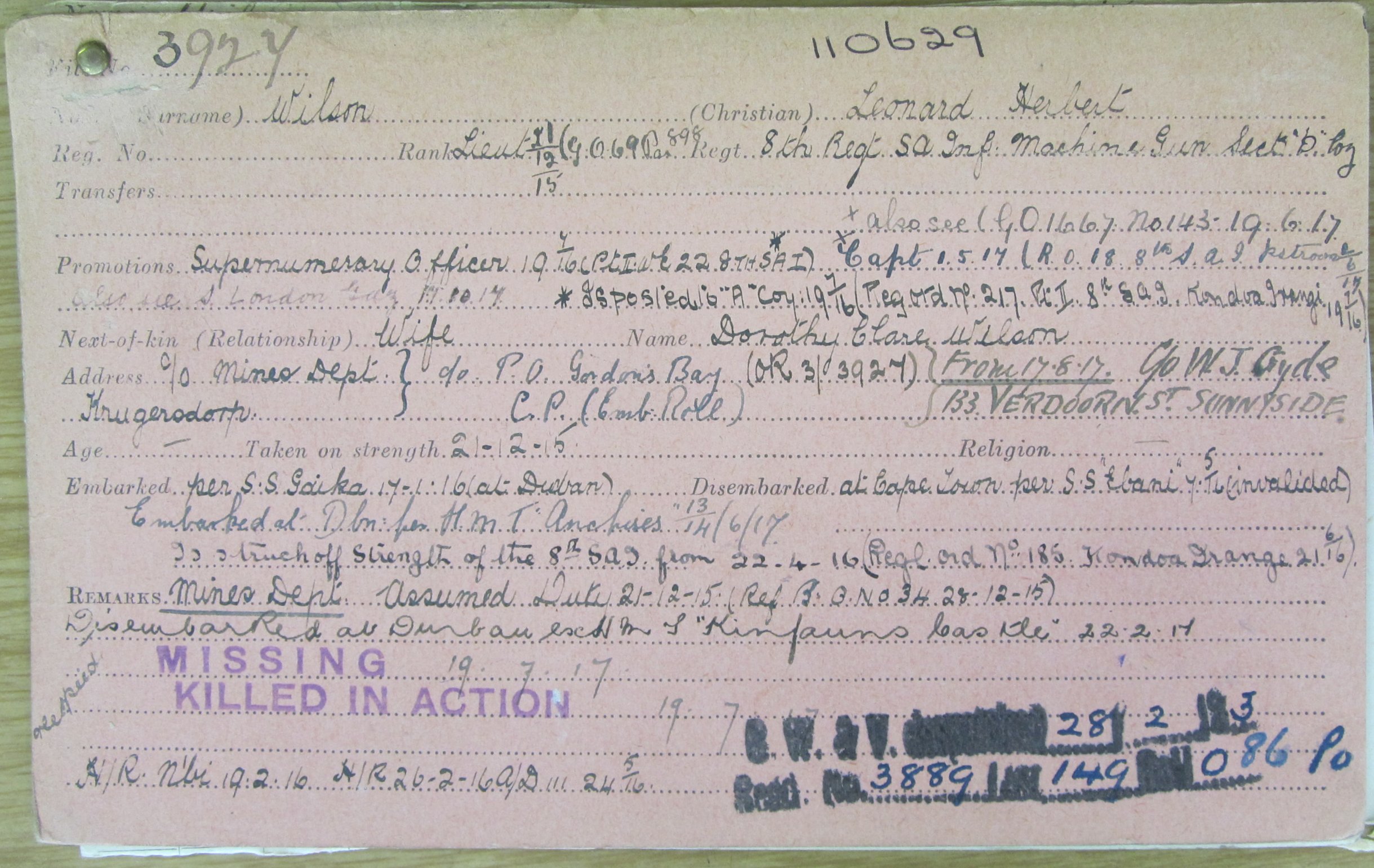 Son of John Lamb Wilson and Ellen Wilson; husband of Dorothy Clare Wilson, of 18, Chestnut Rd., West Norwood, London, England. Served in the South African Campaign, also in German South-West Africa. Born in New Zealand.
