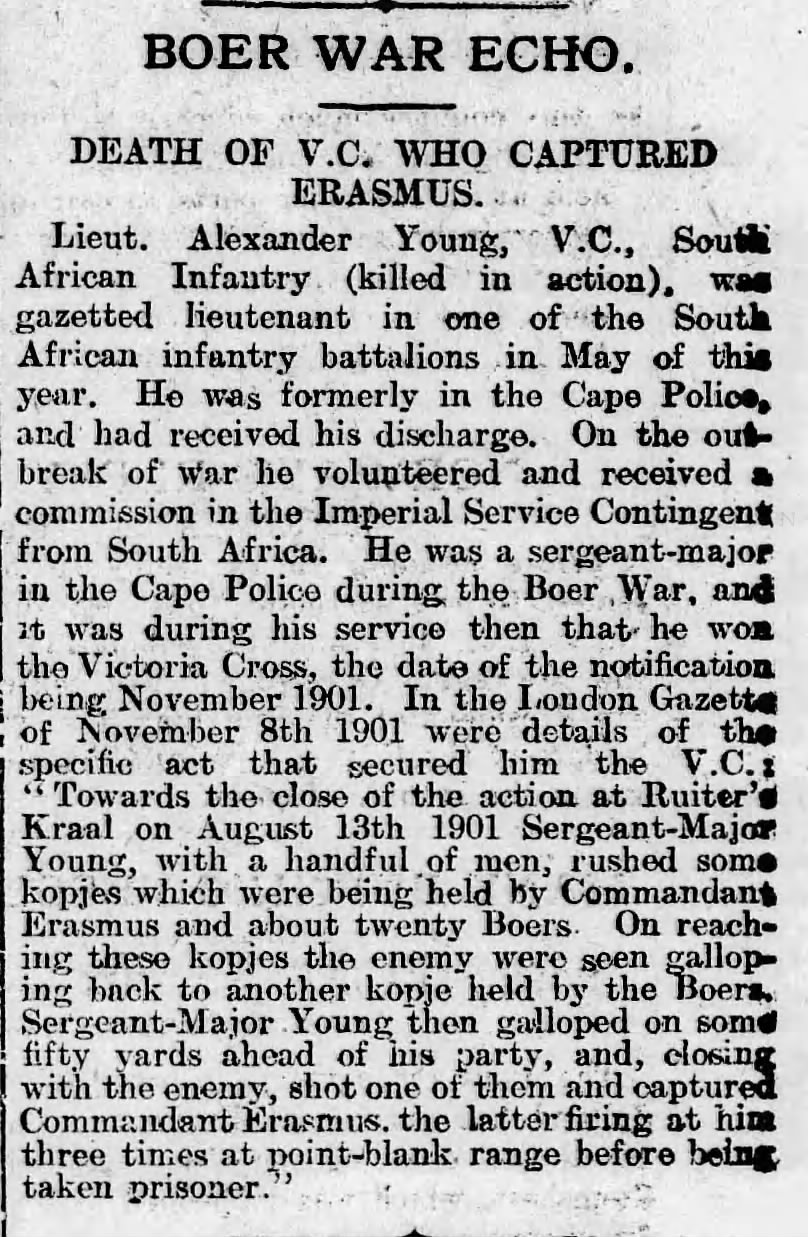 An extract taken from the London Gazette dated 8th November, 1901 records the following; "Towards the close of the action at Ruiter's Kraal (South African War). on the 13th August, 1901, Sergeant-Major Young, with a handful of men, rushed some kopjes which were being held by the Boers. Sergeant Major Young then galloped on some 50 yards ahead of his party and closing with the enemy shot one of them and captured Commandant Erasmus, the latter firing at him three times at point blank range before being taken prisoner." |