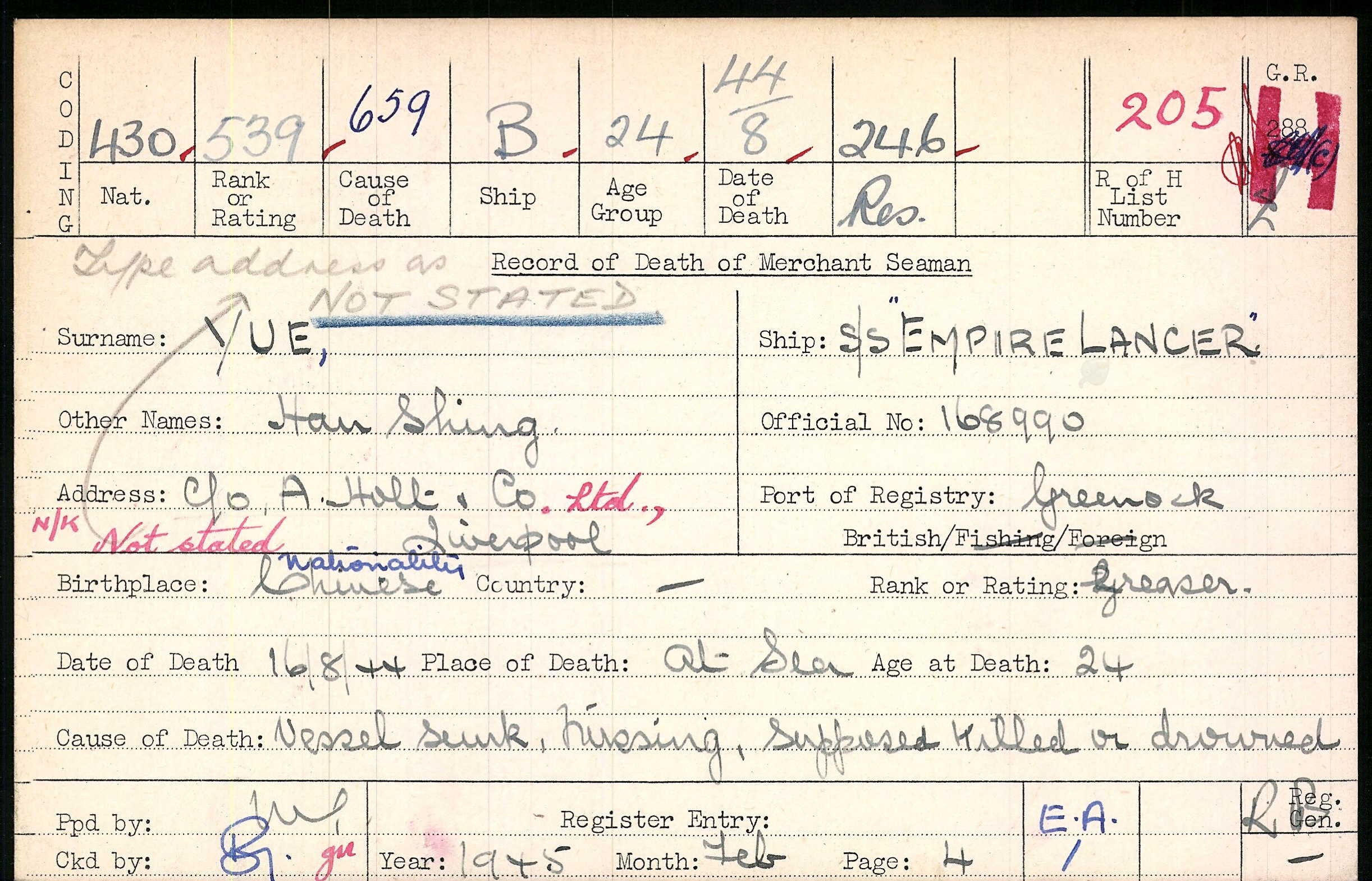 S.S. Empire Lancer (Greenock)Other Casualties from this Unit |