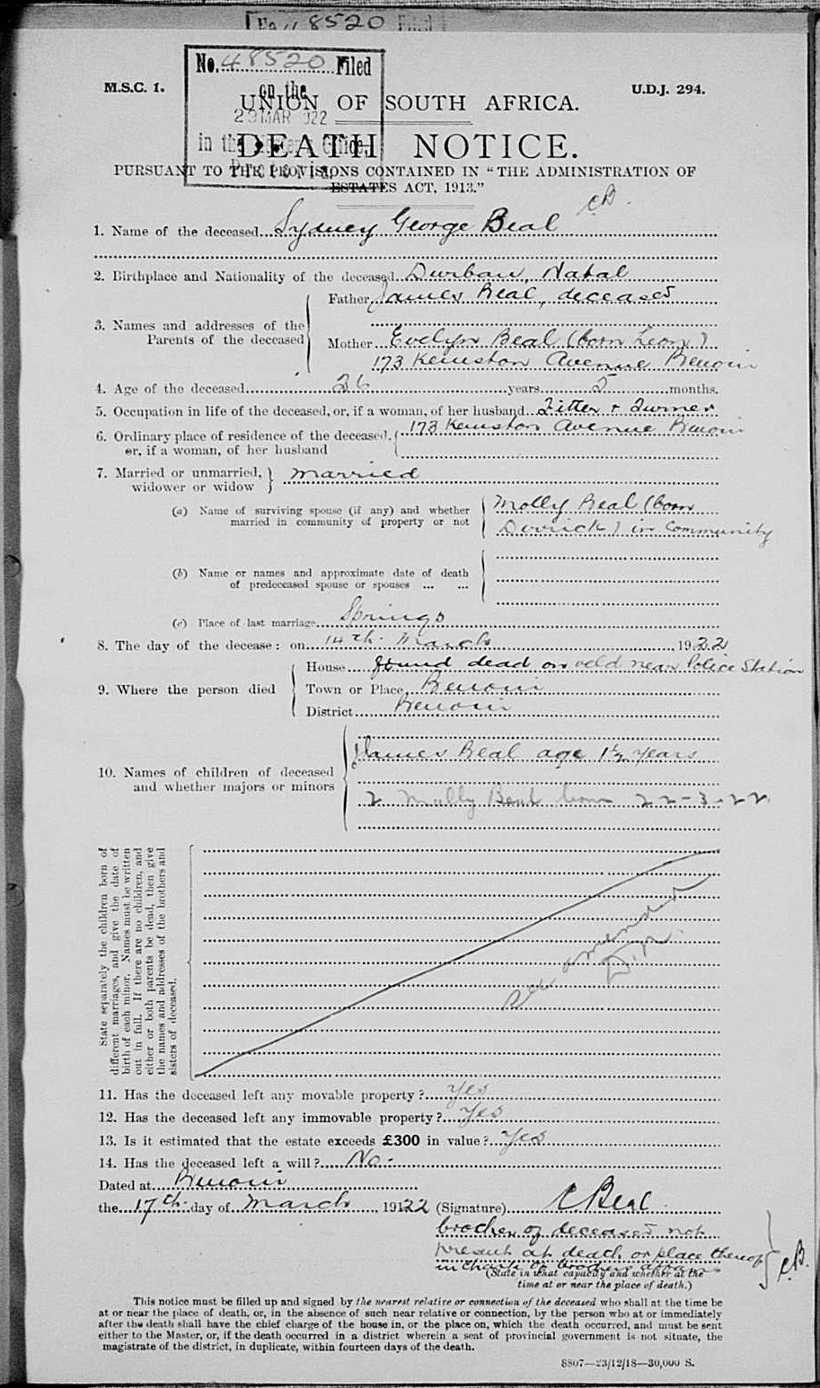 Son of James and Evelyn Beal. Born Durban, Natal. A fitter and turner.