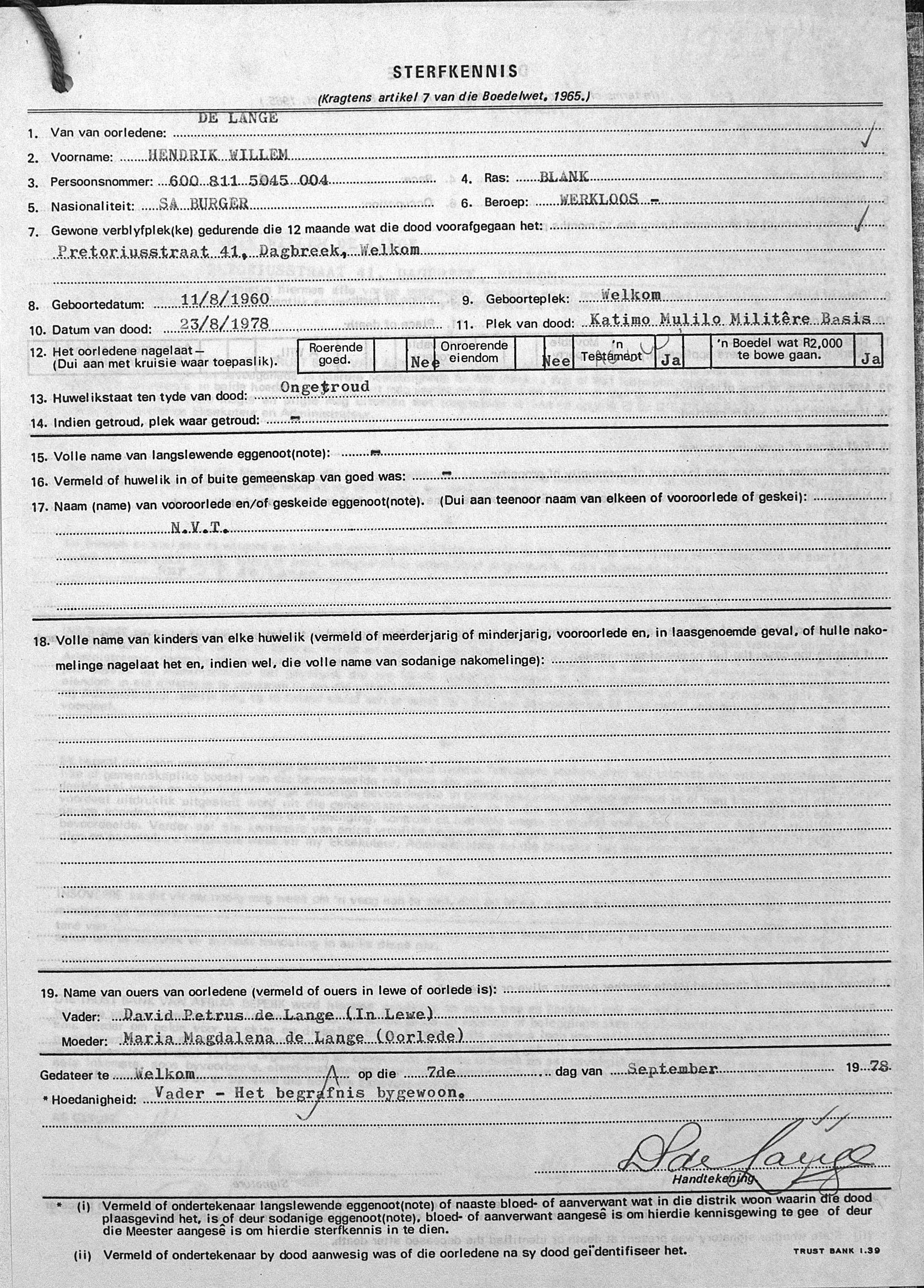 Killed in action, during the early hours of the morning when the bungalow in which they were sleeping at Katima Mulilo received a direct hit from a Soviet GRAD-P 122mm High Explosive Katyusha Rocket. SWAPO/PLAN insurgents operating from Zambia fired 20 x 122mm GRAD-P Katyusha Rockets into the town. 18 rockets exploded harmlessly in the veld, one struck a school in the Katima Mulilo Township and the other demolished the Bungalow in which the soldiers were sleeping |