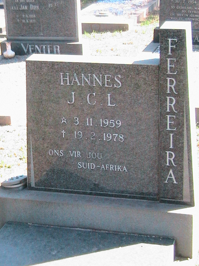 Son of Mr. J. C. L. Ferreira, of Hospital Park, Bloemfontein. Riflemen Hunter, Bosch and Ferreira were on guard duty at a small post near the waterhole at Elundu, when their position was overrun by SWAPO. In the same incident, Sapper van der Mescht was captured and taken to Angola. |