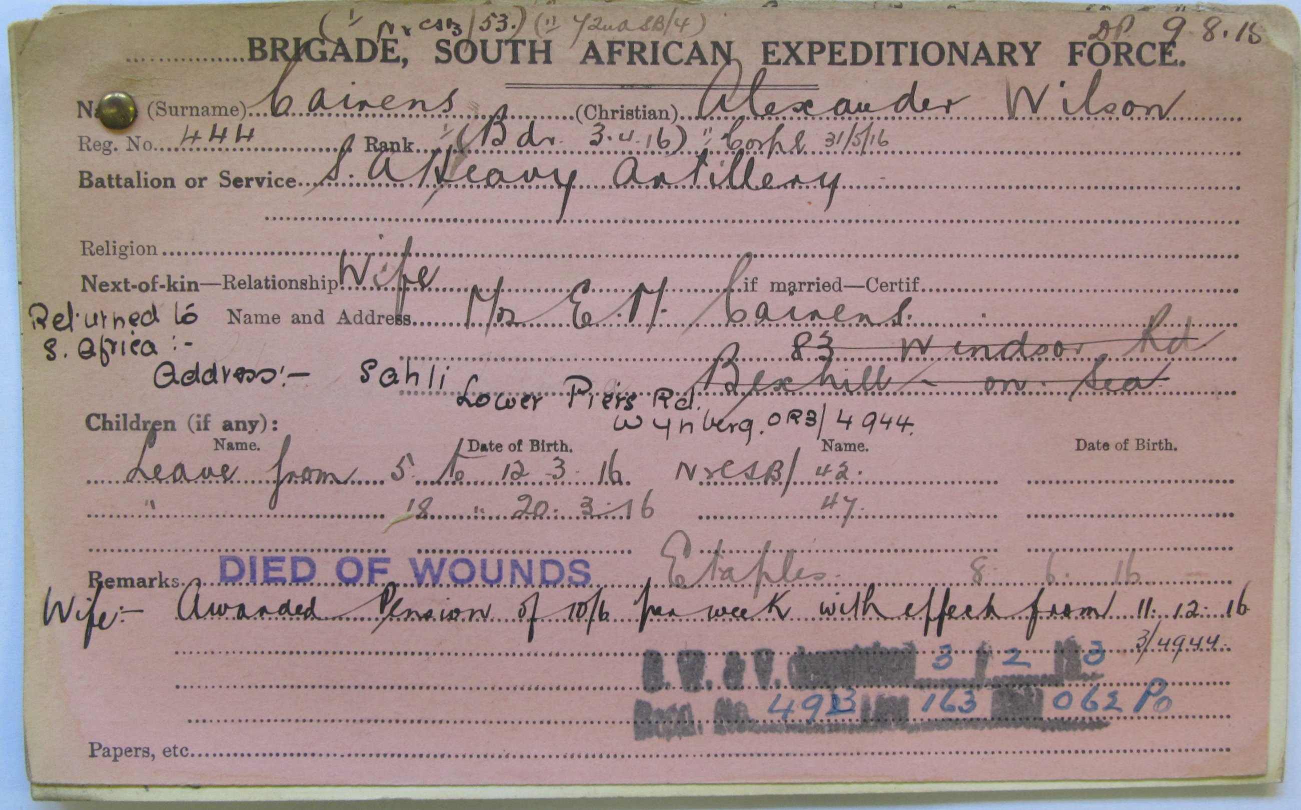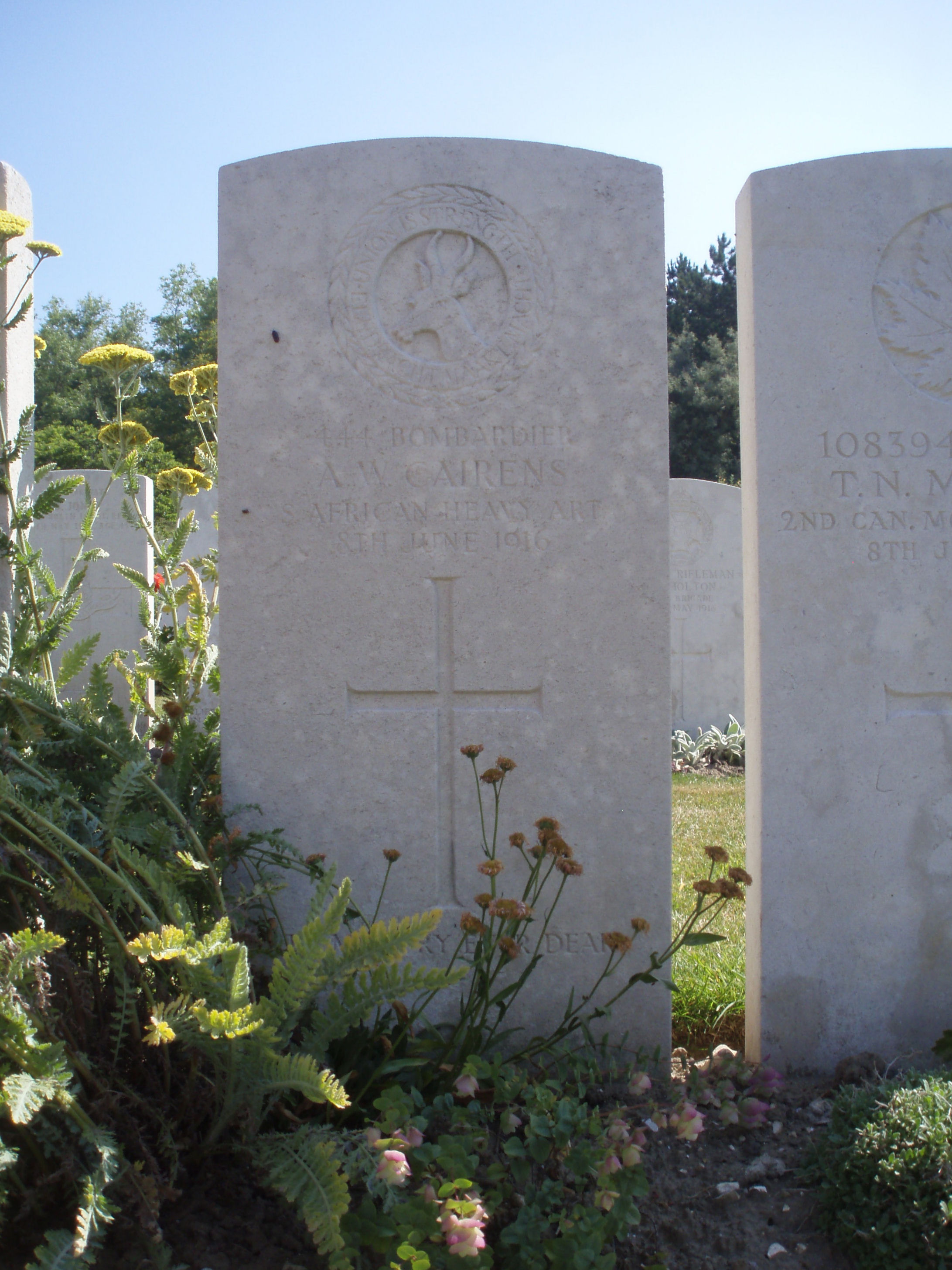Son of Robert and Margaret Ann Cairens, of Berwick-upon-Tweed. Husband of Edith Mary Cairens, of Cape Town. Born Berwick-upon-Tweed, Northumberland, England. Employed with mining in Rhodesia. On Cape Town "Company Gardens" Artillery Memorial