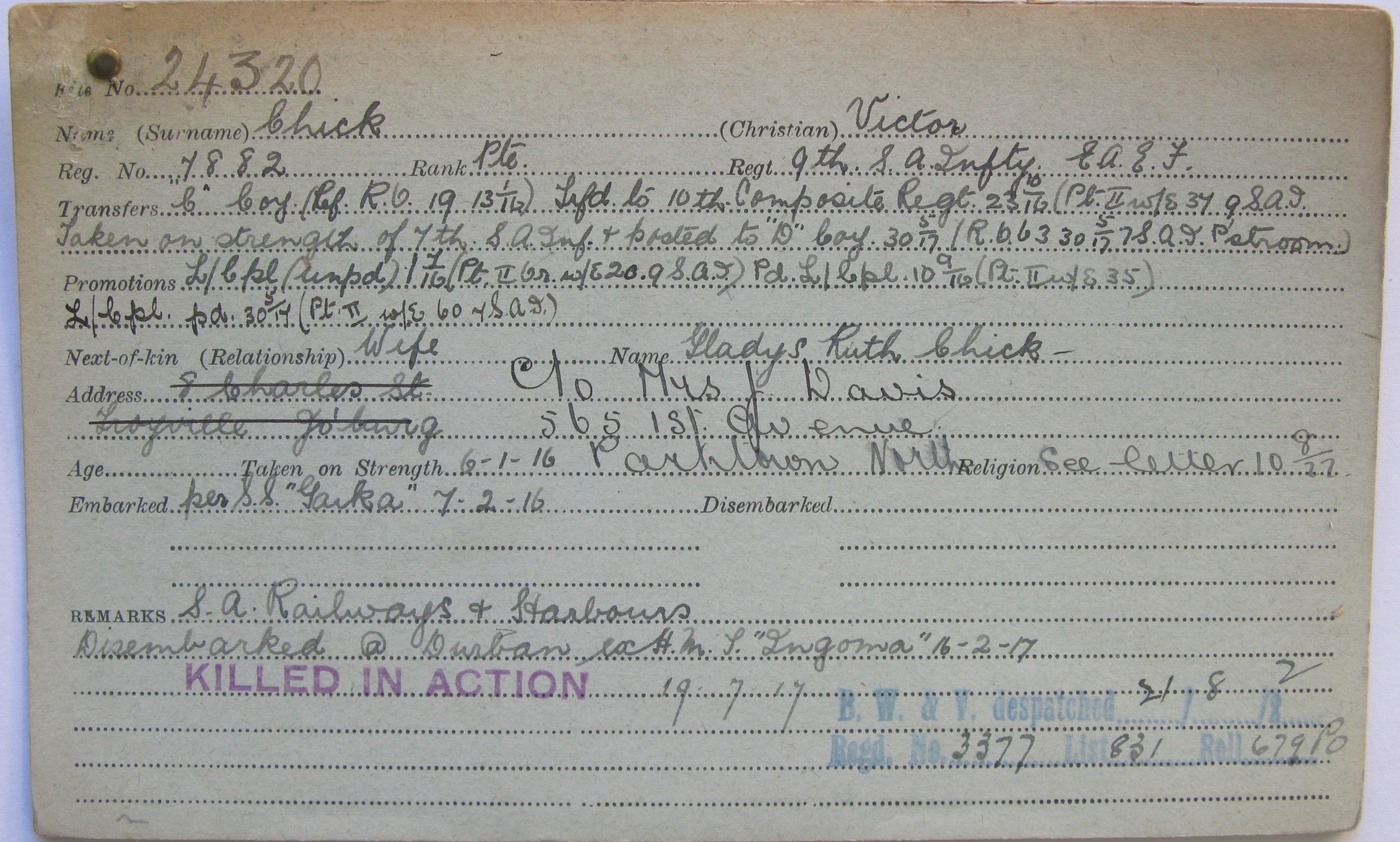 Son of George Henry and Anne Alice (nee Gee) Chick, of Pietermaritzburg; husband of Gladys Ruth (nee Davis) Chick, of 68, First Avenue, Parktown North, Johannesburg, South Africa. Born Pietermaritzburg. Commemorated on Maritzburg College cenotaph. Commemorated on Bezuidenhout Valley War Memorial. Alternative commemoartion - buried in Narungombe Military Graves