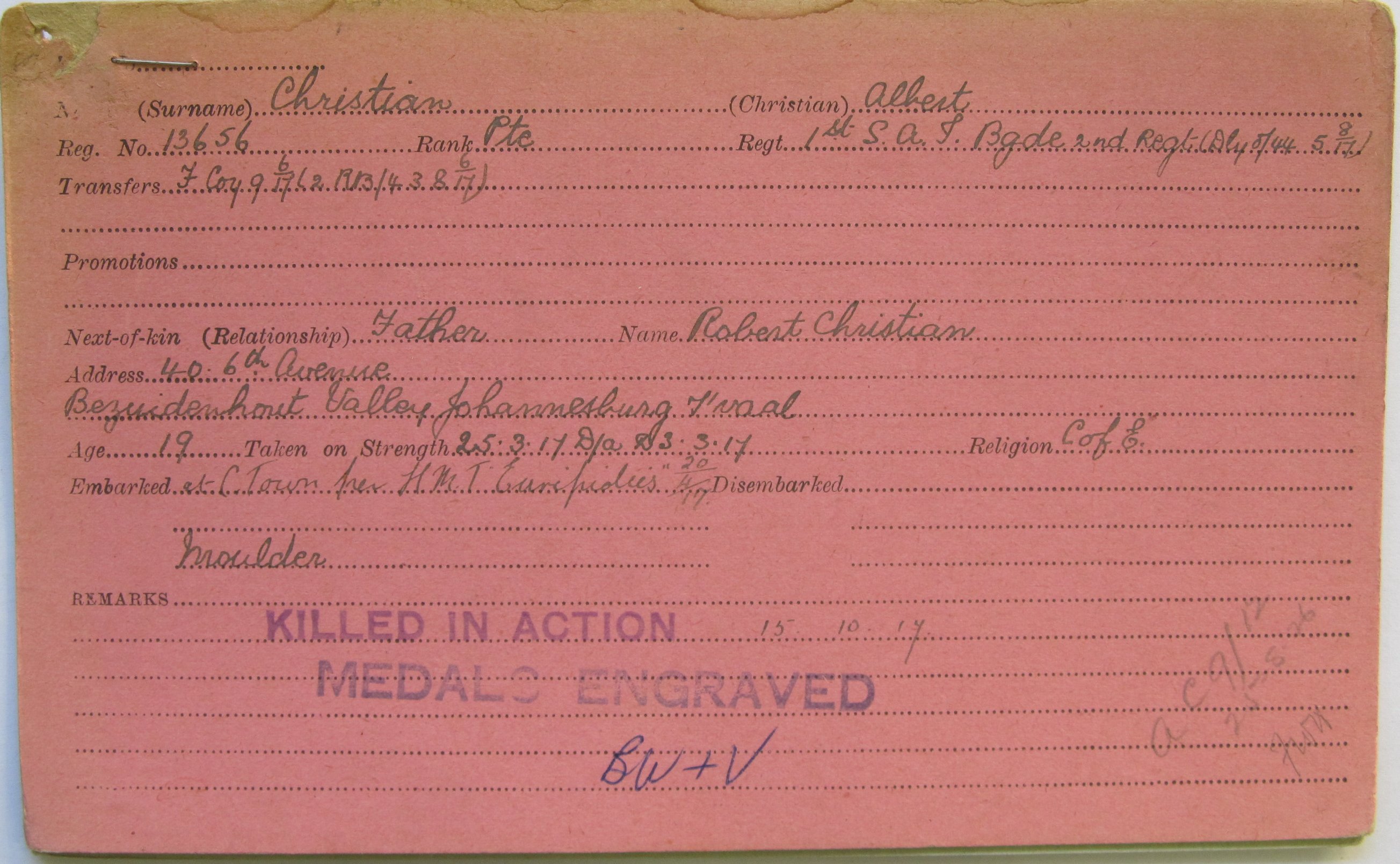 Son of Robert Christian, of Bezuidenhout Valley, Johannesburg, Transvaal. On Bezuidenhout Valley War Memorial |