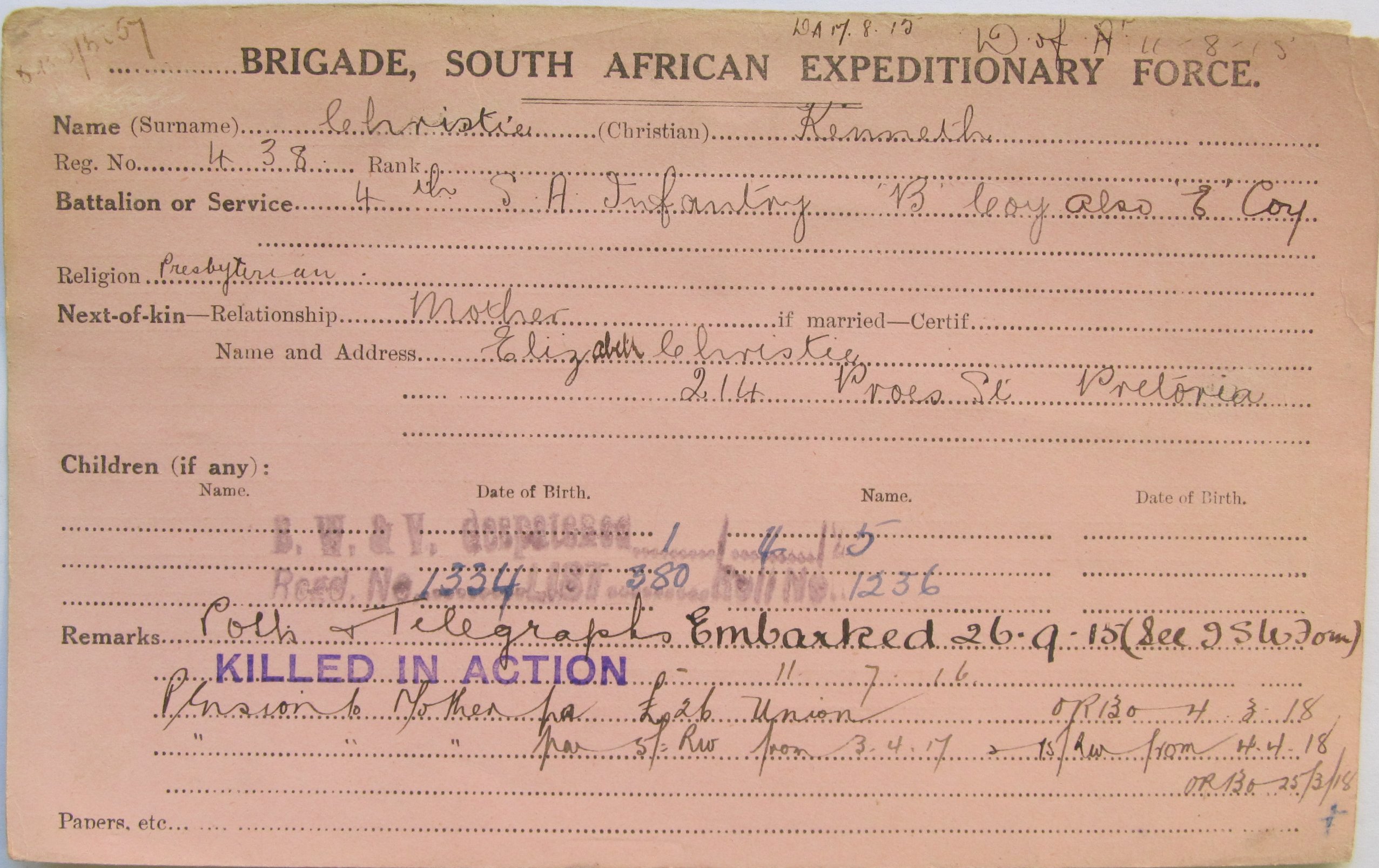 Son of William and Elizabeth Christie, of 99, Market Street, Pretoria. Born Lochee, Dundee, Scotland. A post office employee. Age 16 years, 6 months
