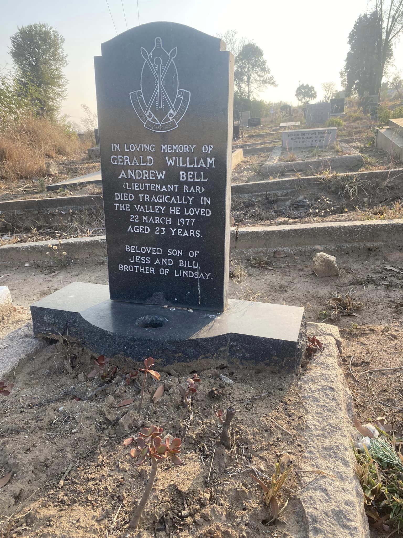Son of Jess and Bill Bell. Brother to Lindsay. A Guinea Fowl School old boy. ref. "Rhodesian African Rifles Roll of Honour" by Adrian Haggett and Gerry van Tonder. |