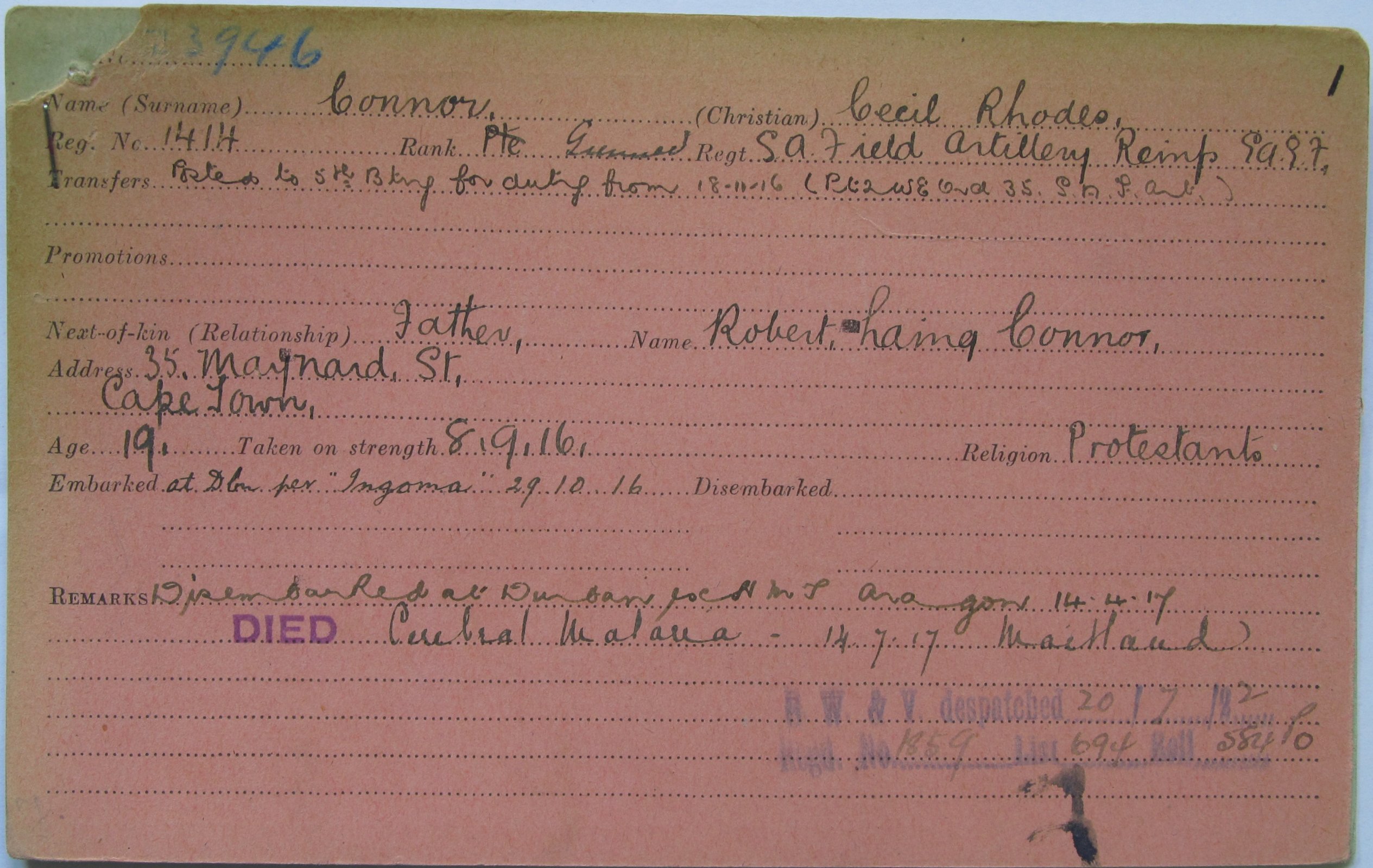 Son of Robert Laing Connor and Margaret Connor, of 15, Gordon St., Cape Town. |