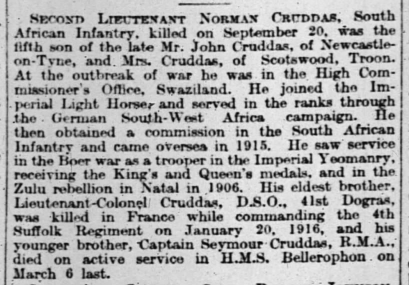 Son of Annie Cruddas, of Scotswood, Troon, Ayrshire, and the late John Cruddas.
