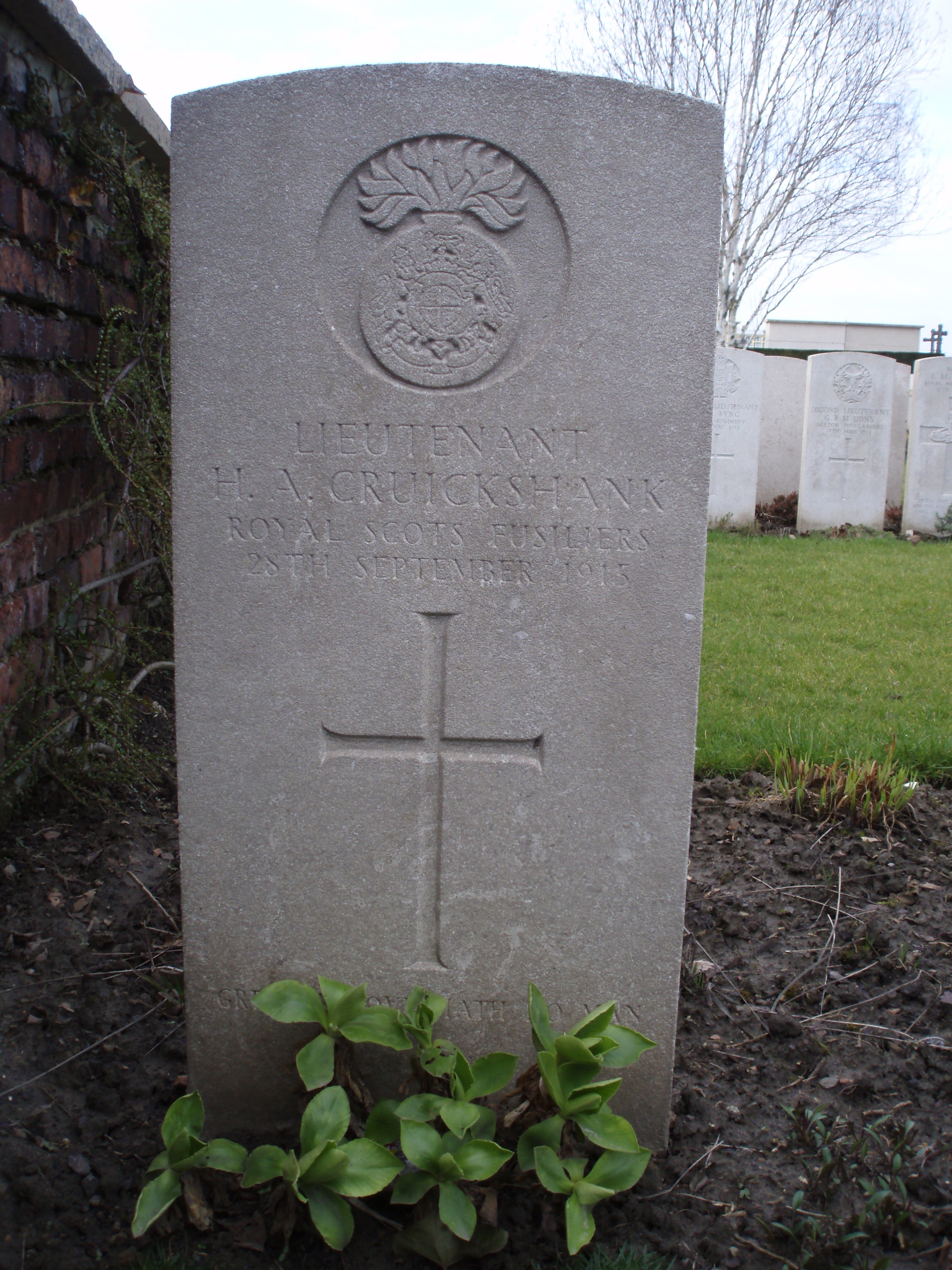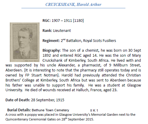 Son of William and Mary Cruickshank, of 3, Parson's Lane, West End, Kimberley, South Africa. Educated at the Christian Brothers' College Kimberley but was sent to Aberdeen to live with his uncle, Alexander, a pharmacist, as his father was unable to support the family. There he studied at Robert Gordon's College. In 1911 he came to the University of Glasgow to study the arts and later studied medicine, winning prizes in both areas. During his time at university Harold had been a member of the University of Glasgow Officer Training Corps and so postponed his studies to join the war effort, enlisting in the 3rd Battalion of the Royal Scots Fusiliers in February 1915. On 27 May 1915, the Supplement to the London Gazette reported that he was promoted from Second Lieutenant to Lieutenant on 13th April 1915. Commemorated on CBC Kimberley / St Patrick's College; the Kimberley (panel 4) & the University of Glasgow War Memorial Chapel WWI Memorials |