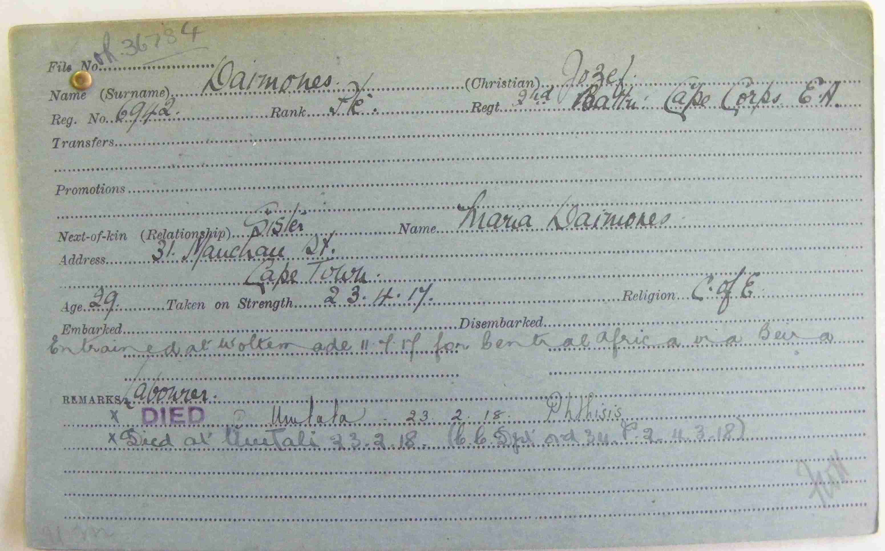 Brother of Maria Daimones, of 31 Mauchau Street, Cape Town