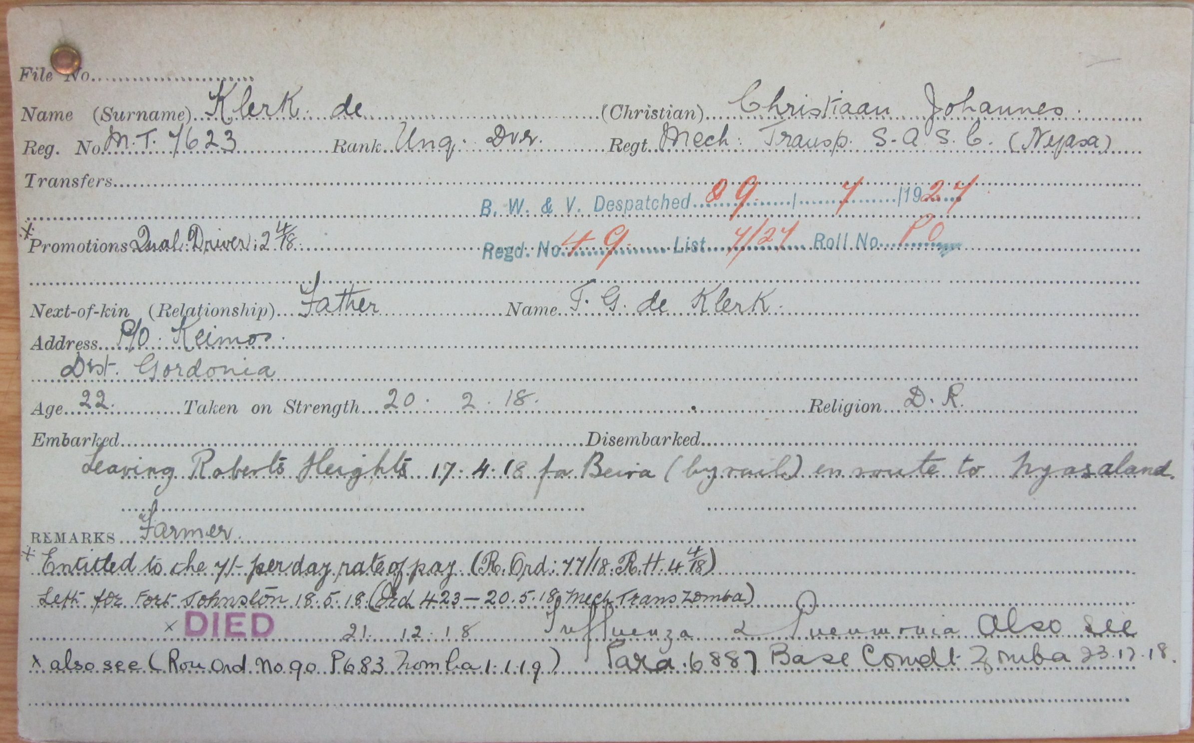 Son of T. G. de Klerk; husband of Johanna Crinula Jacoba Jehan de Klerk, of Keikrup, Gordonia, Cape Province.