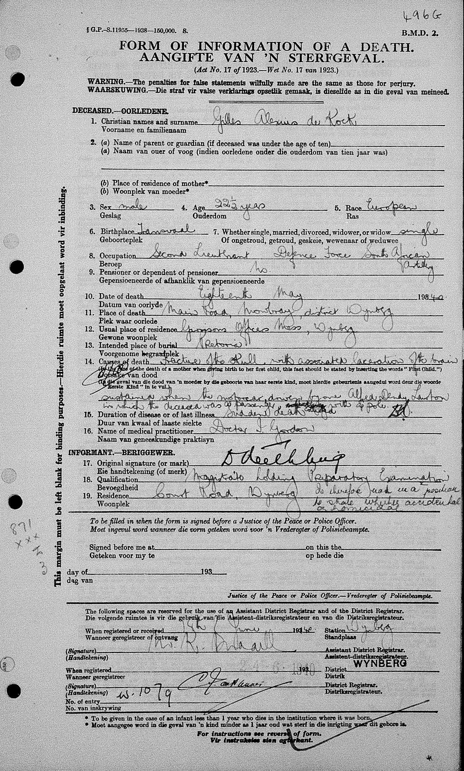 Died in Motor Vehicle Accident, head injuries, received as passenger in vehicle that struck a pole in Mowbray, Cape Town |